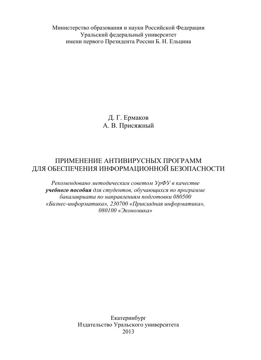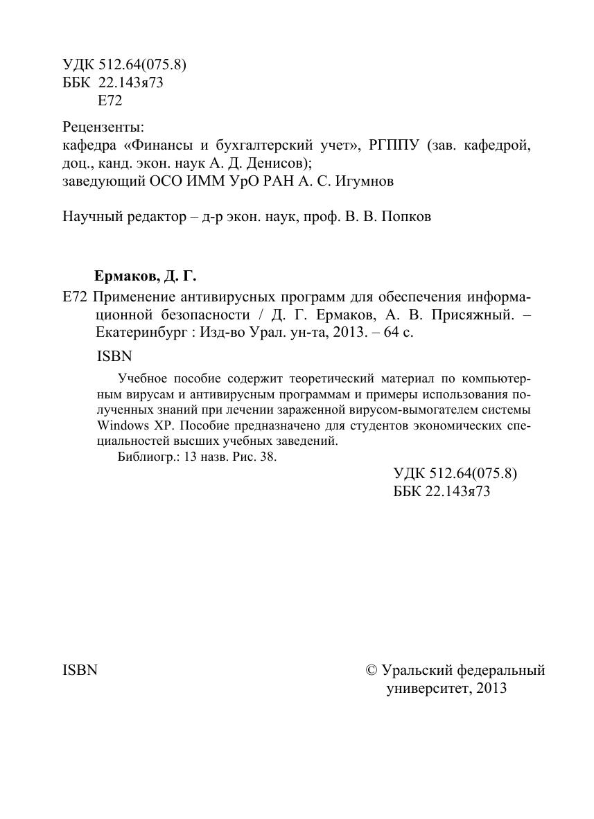 Учебное пособие содержит теоретический материал по компьютерным вирусам и антивирусным программам и примеры использования полученных знаний при лечении зараженной вирусом-вымогателем системы Windows XP. Пособие предназначено для студентов экономических специальностей высших учебных заведений.
