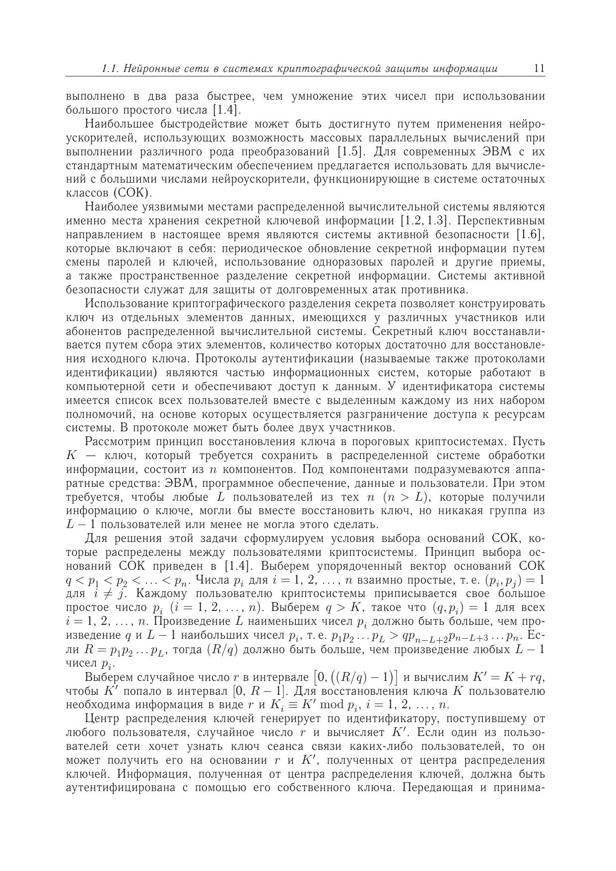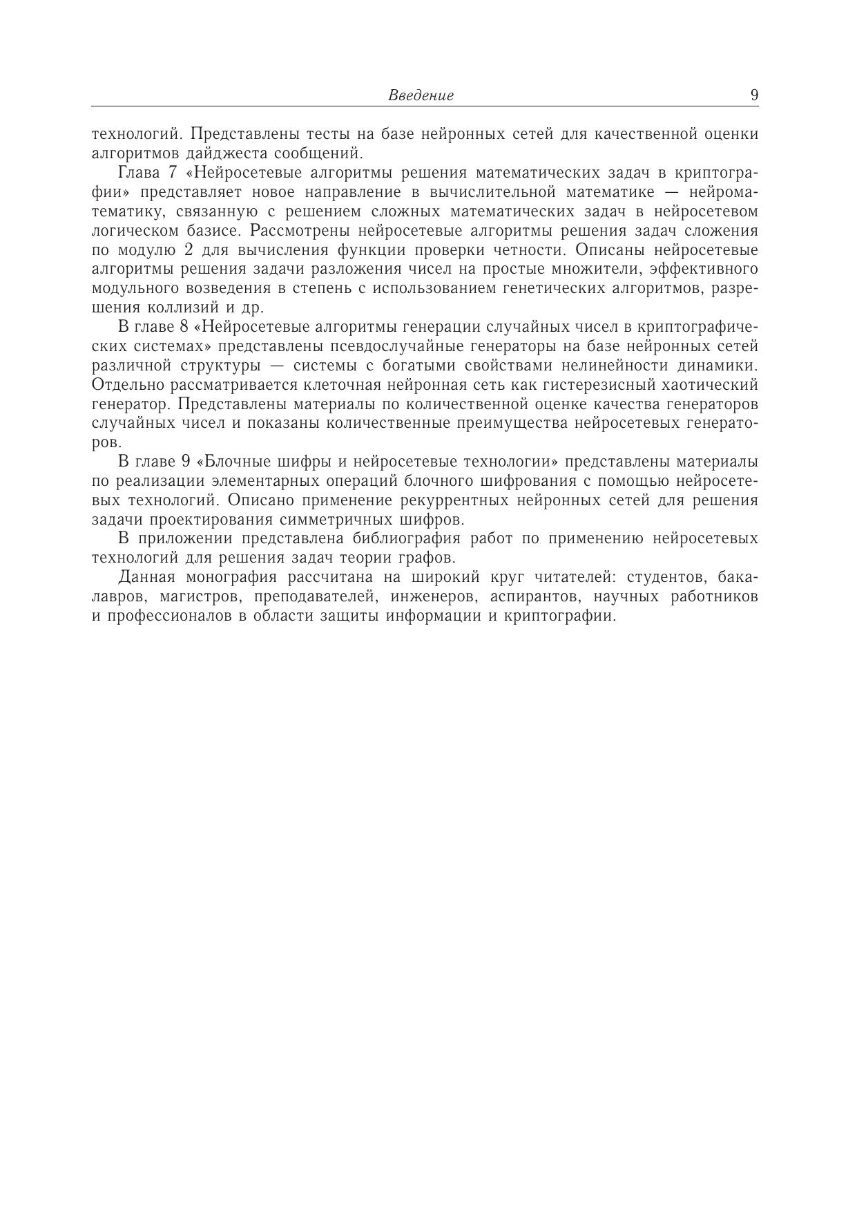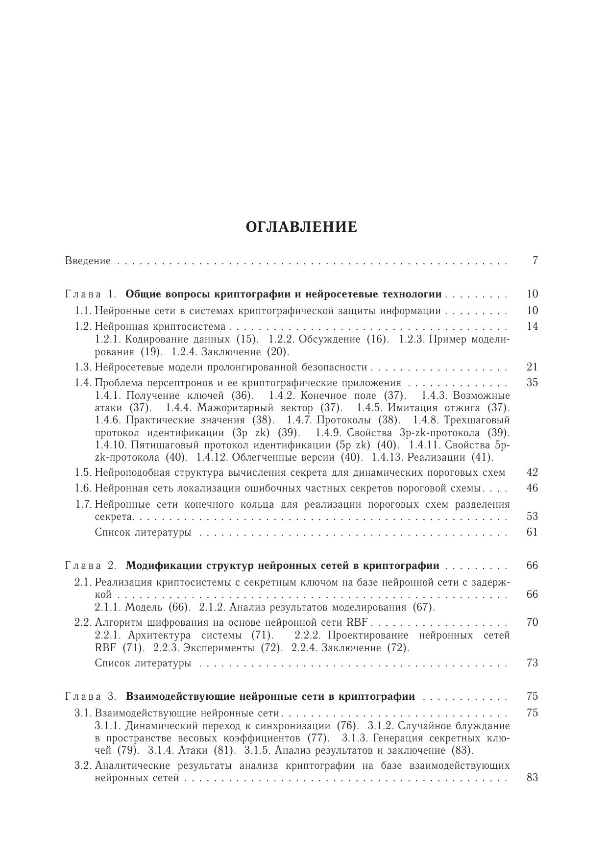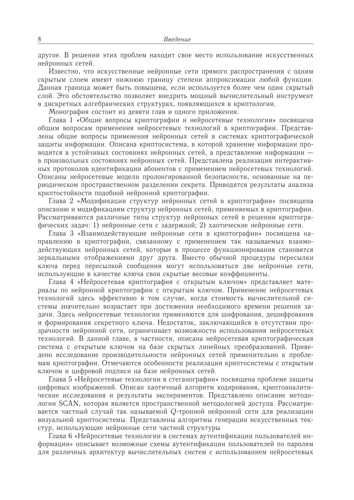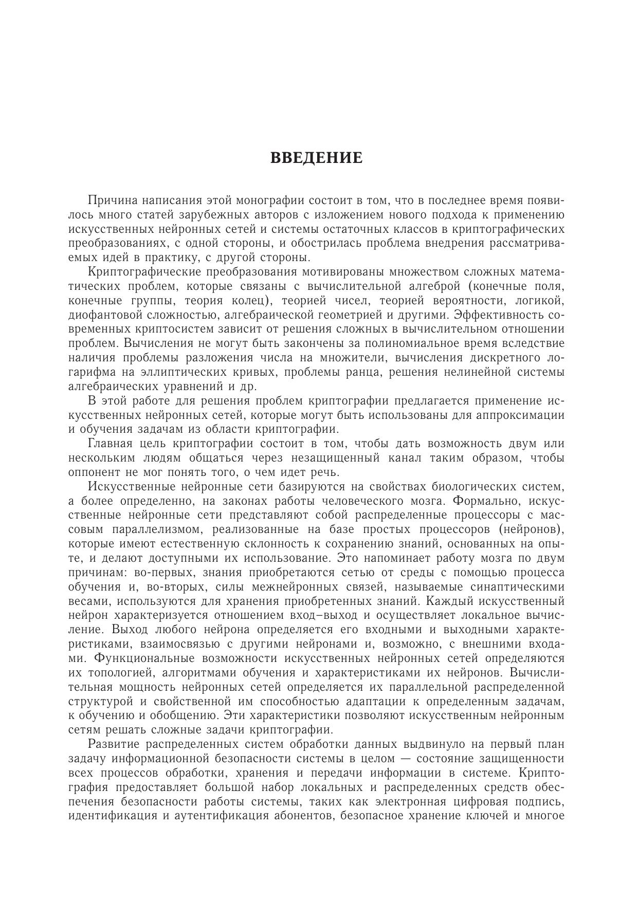 В монографии изложены идеи искусственных нейронных сетей и системы остаточных классов в их приложении к криптографии, причем рассмотрены различные типы искусственных нейронных сетей. Представлены результаты научных исследований за последнее десятилетие в области защиты информации с применением элементов искусственного интеллекта и модулярной арифметики. Изложенные результаты представляют значительный интерес для современных разработчиков нейросетевых криптосистем на базе системы остаточных классов. Приведена библиография работ по применению нейрокомпьютеров для решения задач теории графов.Для студентов, бакалавров, магистров, аспирантов, научных работников и специалистов в области информационной безопасности, занимающихся вопросами применения искусственных нейронных сетей и системы остаточных классов в криптографии.