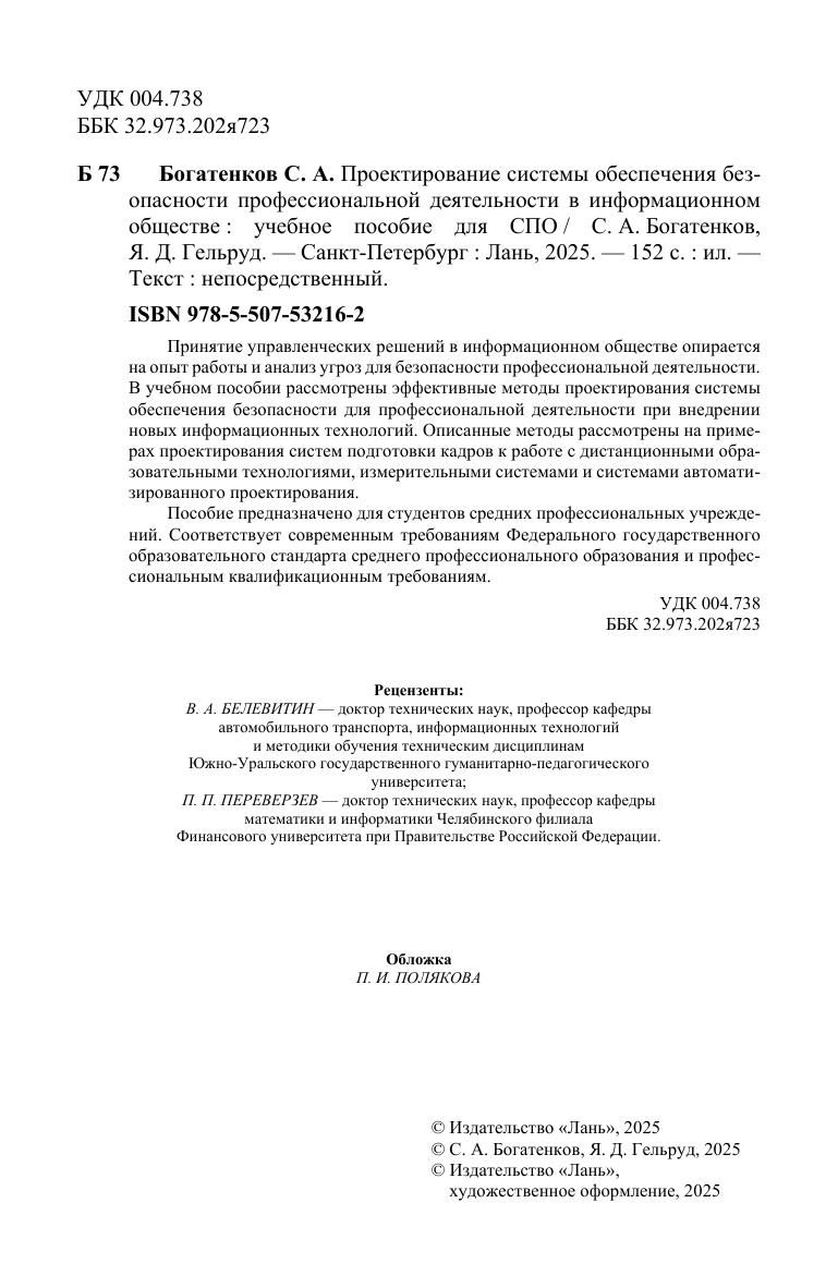 Принятие управленческих решений в информационном обществе опирается на опыт работы и анализ угроз для безопасности профессиональной деятельности. В учебном пособии рассмотрены эффективные методы проектирования системы обеспечения безопасности для профессиональной деятельности при внедрении новых информационных технологий. Описанные методы рассмотрены на примерах проектирования систем подготовки кадров к работе с дистанционными образовательными технологиями, измерительными системами и системами автоматизированного проектирования. Пособие предназначено для студентов средних профессиональных учреждений. Соответствует современным требованиям Федерального государственного образовательного стандарта среднего профессионального образования и профессиональным квалификационным требованиям.