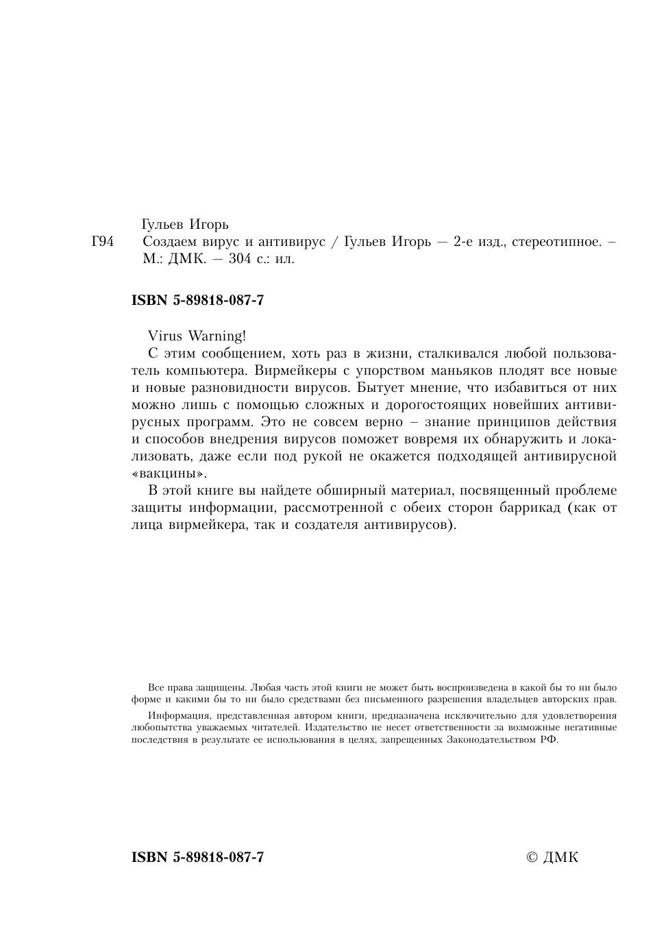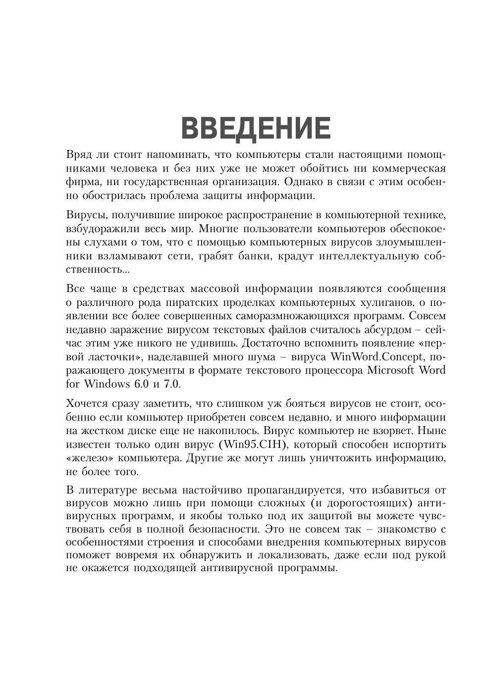 Virus Warning! С этим сообщением, хоть раз в жизни, сталкивался любой пользователь компьютера. Вирмейкеры с упорством маньяков плодят все новые и новые разновидности вирусов. Бытует мнение, что избавиться от них можно лишь с помощью сложных и дорогостоящих новейших антивирусных программ. Это не совсем верно – знание принципов действия и способов внедрения вирусов поможет вовремя их обнаружить и локализовать, даже если под рукой не окажется подходящей антивирусной «вакцины». В этой книге вы найдете обширный материал, посвященный проблеме защиты информации, рассмотренной с обеих сторон баррикад (как от лица вирмейкера, так и создателя антивирусов).