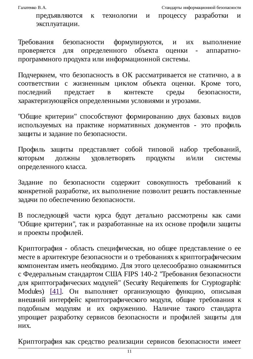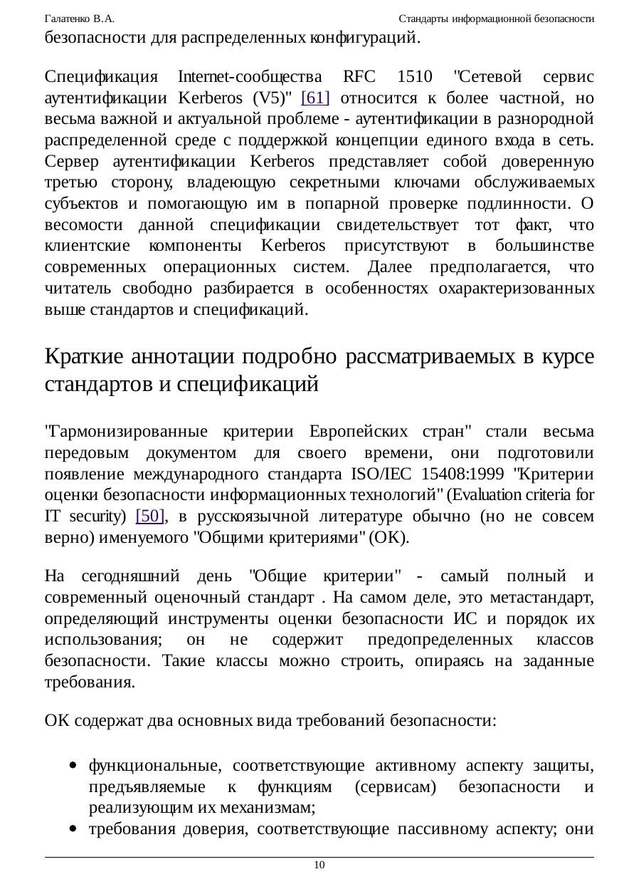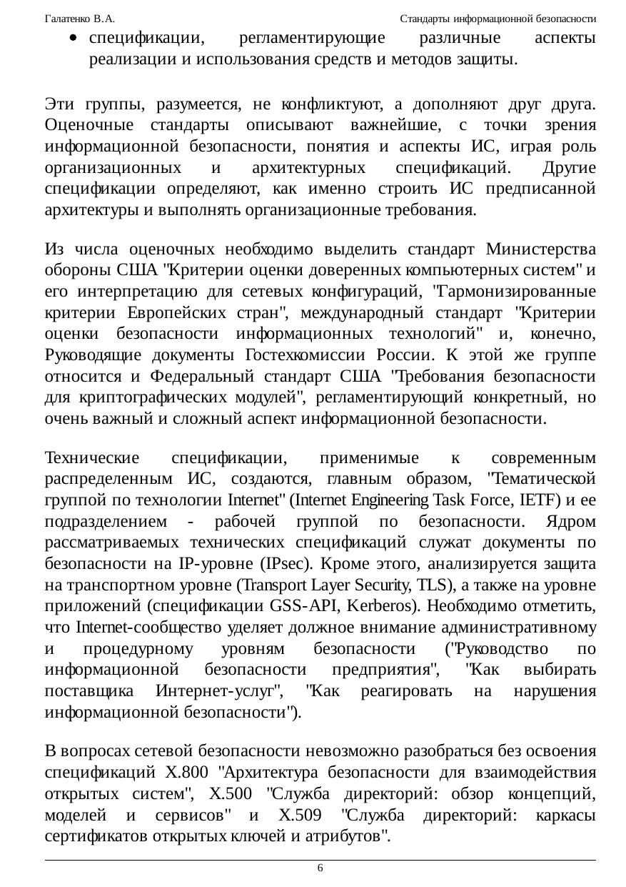 разработанные в рамках Internet-сообщества. Специалистам в области информационной безопасности (ИБ) сегодня почти невозможно обойтись без знаний соответствующих стандартов и спецификаций. На то имеется несколько причин. Формальная состоит в том, что необходимость следования некоторым стандартам (например, криптографическим и/или Руководящим документам Гостехкомиссии России) закреплена законодательно. Однако наиболее убедительны содержательные причины. Во-первых, стандарты и спецификации - одна из форм накопления знаний, прежде всего о процедурном и программно-техническом уровнях ИБ. В них зафиксированы апробированные, высококачественные решения и методологии, разработанные наиболее квалифицированными специалистами. Во-вторых, и те, и другие являются основным средством обеспечения взаимной совместимости аппаратно-программных систем и их компонентов, причем в Internet-сообществе это средство действительно работает, и весьма эффективно. С практической точки зрения, количество стандартов и спецификаций (международных, национальных, отраслевых и т.п.) в области информационной безопасности бесконечно. В курсе рассматриваются наиболее важные из них, знание которых необходимо всем или почти всем разработчикам и оценщикам защитных средств, многим сетевым и системным администраторам, руководителям соответствующих подразделений, пользователям. Отбор проводился таким образом, чтобы охватить различные аспекты информационной безопасности, разные виды и конфигурации информационных систем, предоставить полезные сведения для самых разнообразных групп целевой аудитории. Часть стандартов и спецификаций была рассмотрена в курсе "Основы информационной безопасности" и в монографии автора "Информационная безопасность - практический подход"; в данном курсе о них приводятся лишь краткие сведения. Основное внимание уделяется международному стандарту ISO/IEC 15408-1999 и его российскому аналогу ГОСТ Р ИСО/МЭК 15408-2002 "Критерии оценки безопасности информационных технологий", а также спецификациям Internet- сообщества.