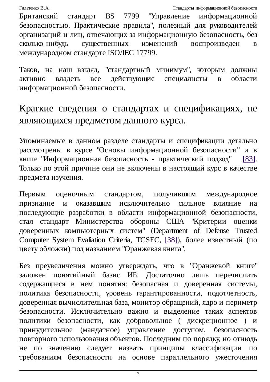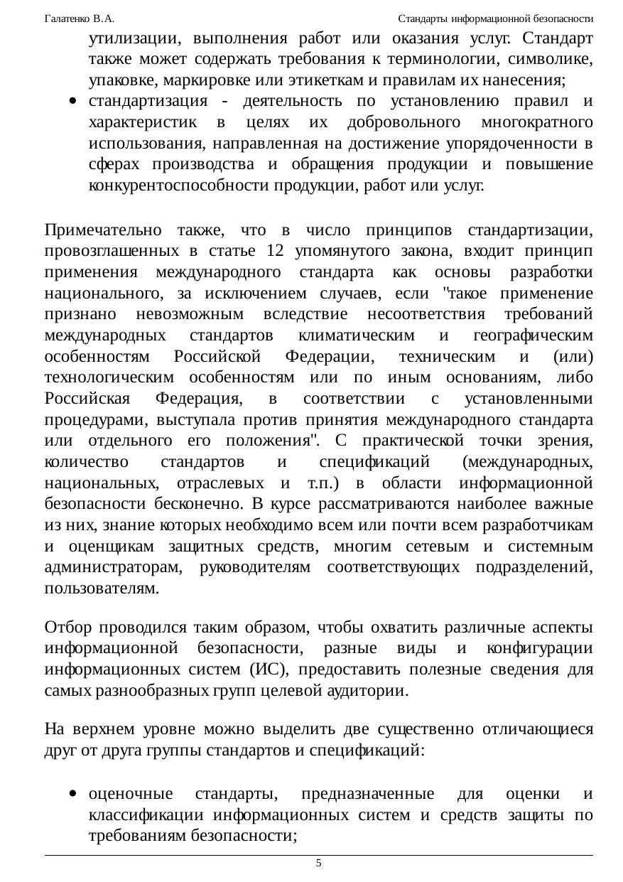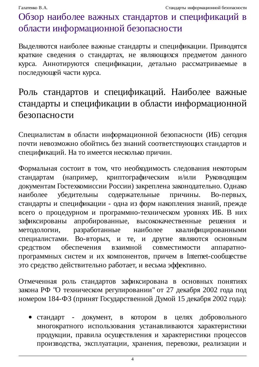 разработанные в рамках Internet-сообщества. Специалистам в области информационной безопасности (ИБ) сегодня почти невозможно обойтись без знаний соответствующих стандартов и спецификаций. На то имеется несколько причин. Формальная состоит в том, что необходимость следования некоторым стандартам (например, криптографическим и/или Руководящим документам Гостехкомиссии России) закреплена законодательно. Однако наиболее убедительны содержательные причины. Во-первых, стандарты и спецификации - одна из форм накопления знаний, прежде всего о процедурном и программно-техническом уровнях ИБ. В них зафиксированы апробированные, высококачественные решения и методологии, разработанные наиболее квалифицированными специалистами. Во-вторых, и те, и другие являются основным средством обеспечения взаимной совместимости аппаратно-программных систем и их компонентов, причем в Internet-сообществе это средство действительно работает, и весьма эффективно. С практической точки зрения, количество стандартов и спецификаций (международных, национальных, отраслевых и т.п.) в области информационной безопасности бесконечно. В курсе рассматриваются наиболее важные из них, знание которых необходимо всем или почти всем разработчикам и оценщикам защитных средств, многим сетевым и системным администраторам, руководителям соответствующих подразделений, пользователям. Отбор проводился таким образом, чтобы охватить различные аспекты информационной безопасности, разные виды и конфигурации информационных систем, предоставить полезные сведения для самых разнообразных групп целевой аудитории. Часть стандартов и спецификаций была рассмотрена в курсе "Основы информационной безопасности" и в монографии автора "Информационная безопасность - практический подход"; в данном курсе о них приводятся лишь краткие сведения. Основное внимание уделяется международному стандарту ISO/IEC 15408-1999 и его российскому аналогу ГОСТ Р ИСО/МЭК 15408-2002 "Критерии оценки безопасности информационных технологий", а также спецификациям Internet- сообщества.