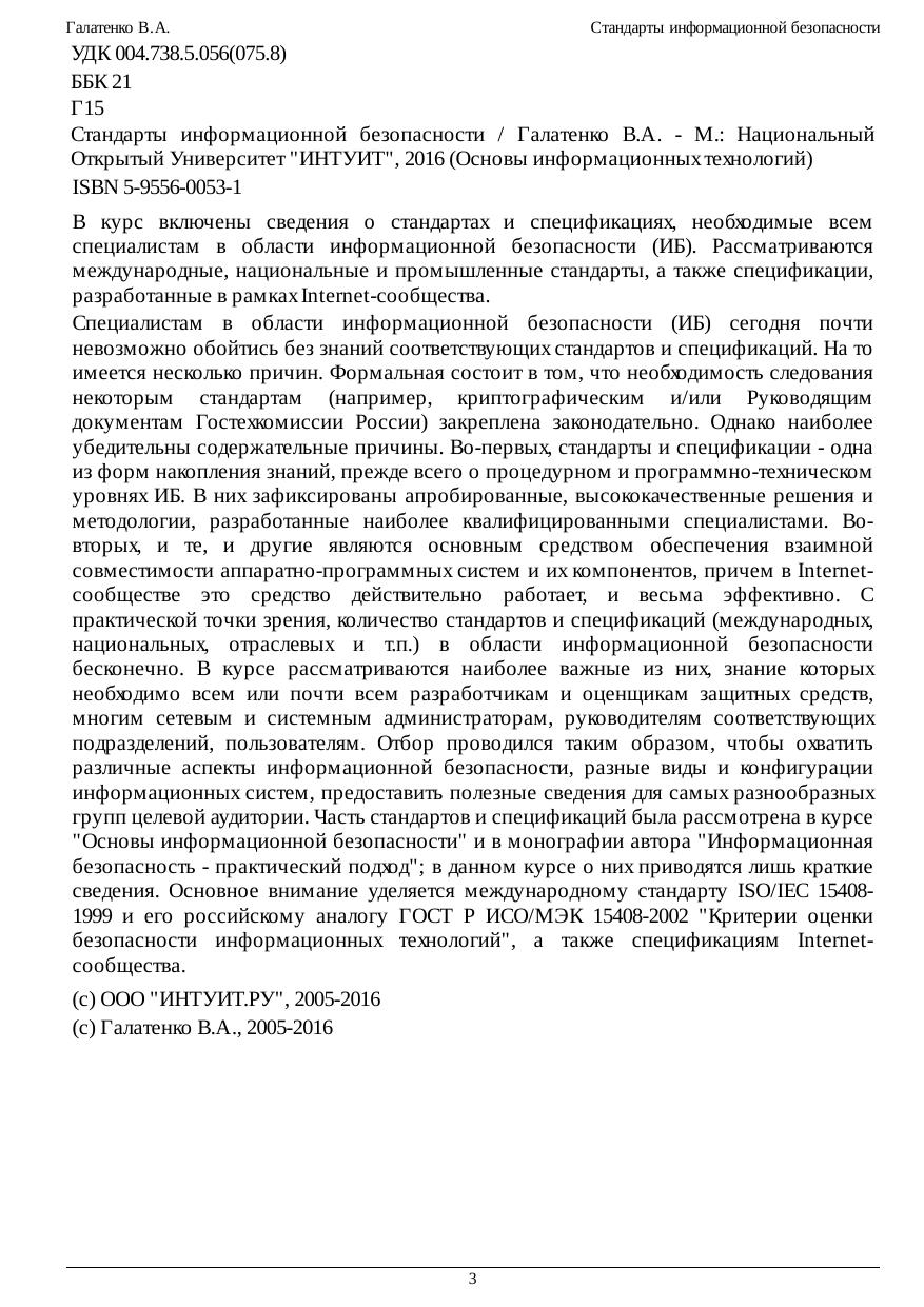 В курс включены сведения о стандартах и спецификациях, необходимые всем специалистам в области информационной безопасности (ИБ). Рассматриваются международные, национальные и промышленные стандарты, а также спецификации,