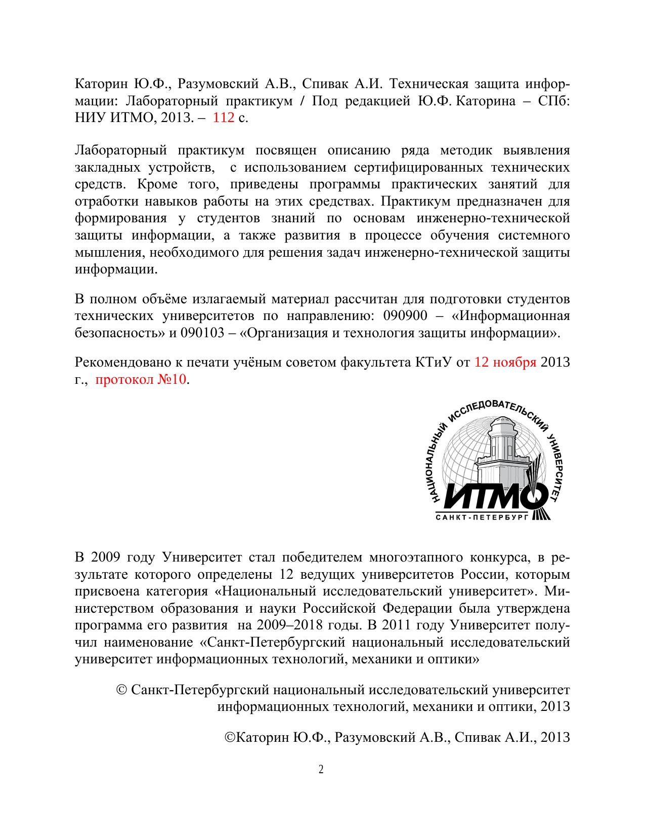 Лабораторный практикум посвящен описанию ряда методик выявления закладных устройств, с использованием сертифицированных технических средств. Кроме того, приведены программы практических занятий для отработки навыков работы на этих средствах. Практикум предназначен для формирования у студентов знаний по основам инженерно-технической защиты информации, а также развития в процессе обучения системного мышления, необходимого для решения задач инженерно технической защиты информации. В полном объёме излагаемый материал рассчитан для подготовки студентов технических университетов по направлению: 090900 – «Информационная безопасность» и 090103 – «Организация и технология защиты информации».