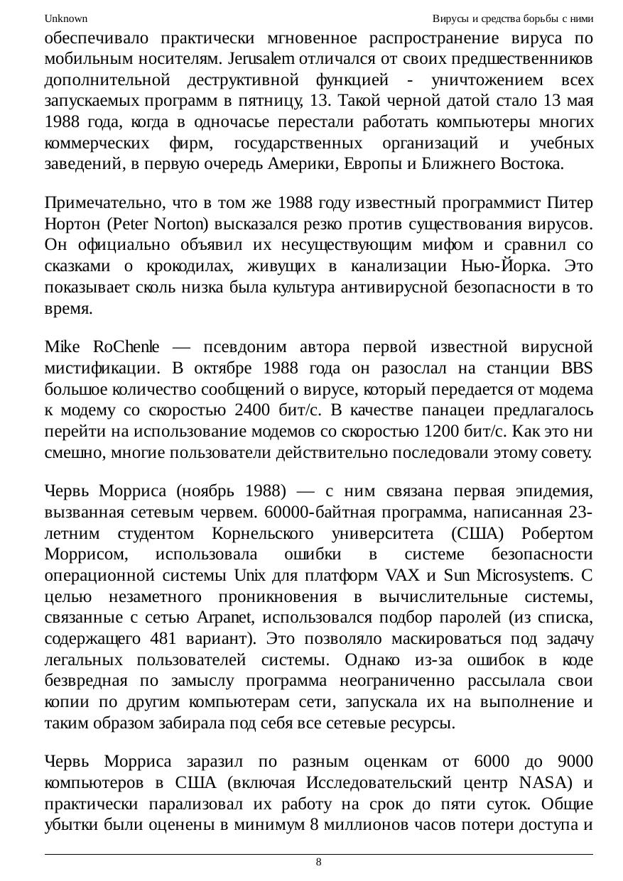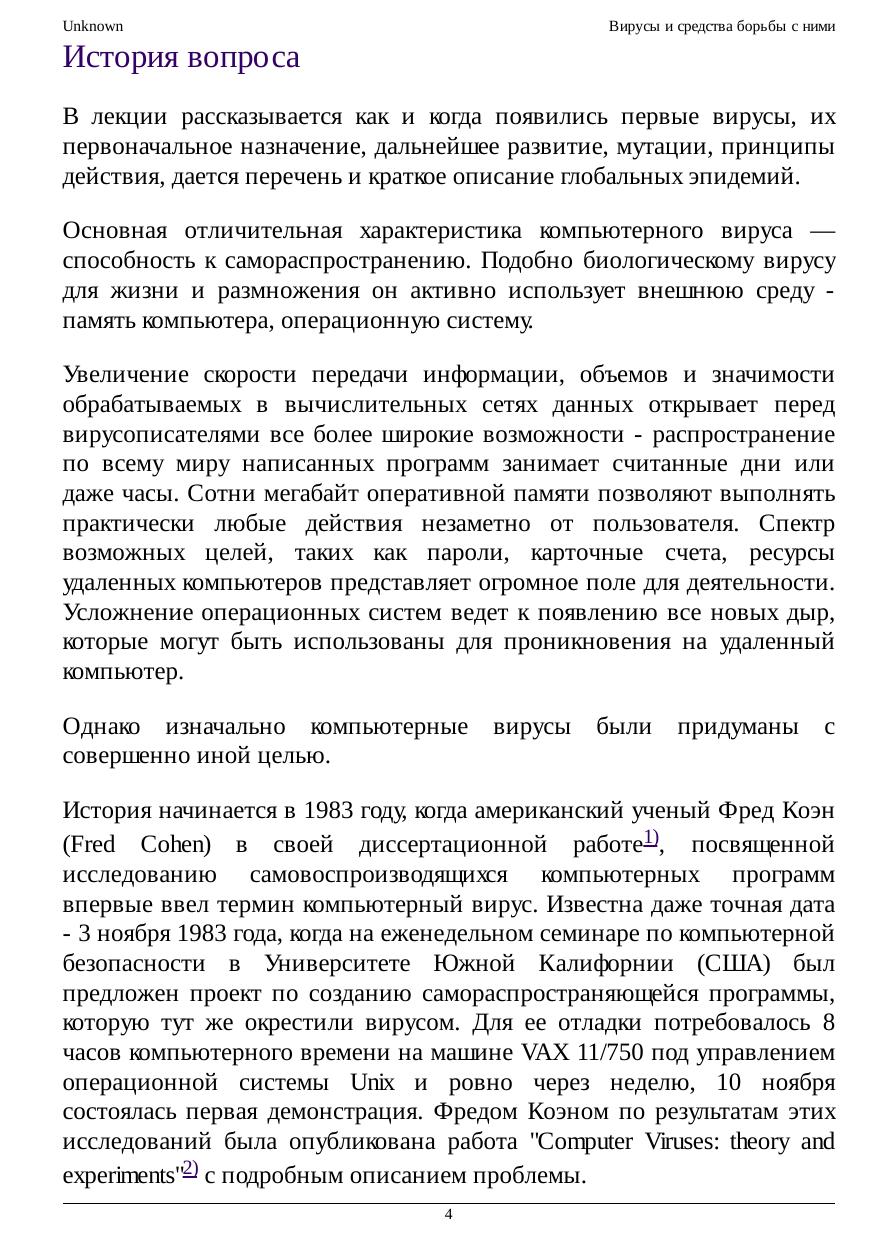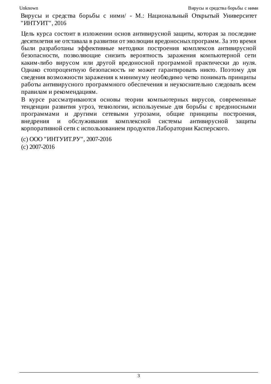 Цель курса состоит в изложении основ антивирусной защиты, которая за последние десятилетия не отставала в развитии от эволюции вредоносных программ. За это время были разработаны эффективные методики построения комплексов антивирусной безопасности, позволяющие снизить вероятность заражения компьютерной сети каким-либо вирусом или другой вредоносной программой практически до нуля. Однако стопроцентную безопасность не может гарантировать никто. Поэтому для сведения возможности заражения к минимуму необходимо четко понимать принципы работы антивирусного программного обеспечения и неукоснительно следовать всем правилам и рекомендациям. В курсе рассматриваются основы теории компьютерных вирусов, современные тенденции развития угроз, технологии, используемые для борьбы с вредоносными программами и другими сетевыми угрозами, общие принципы построения,