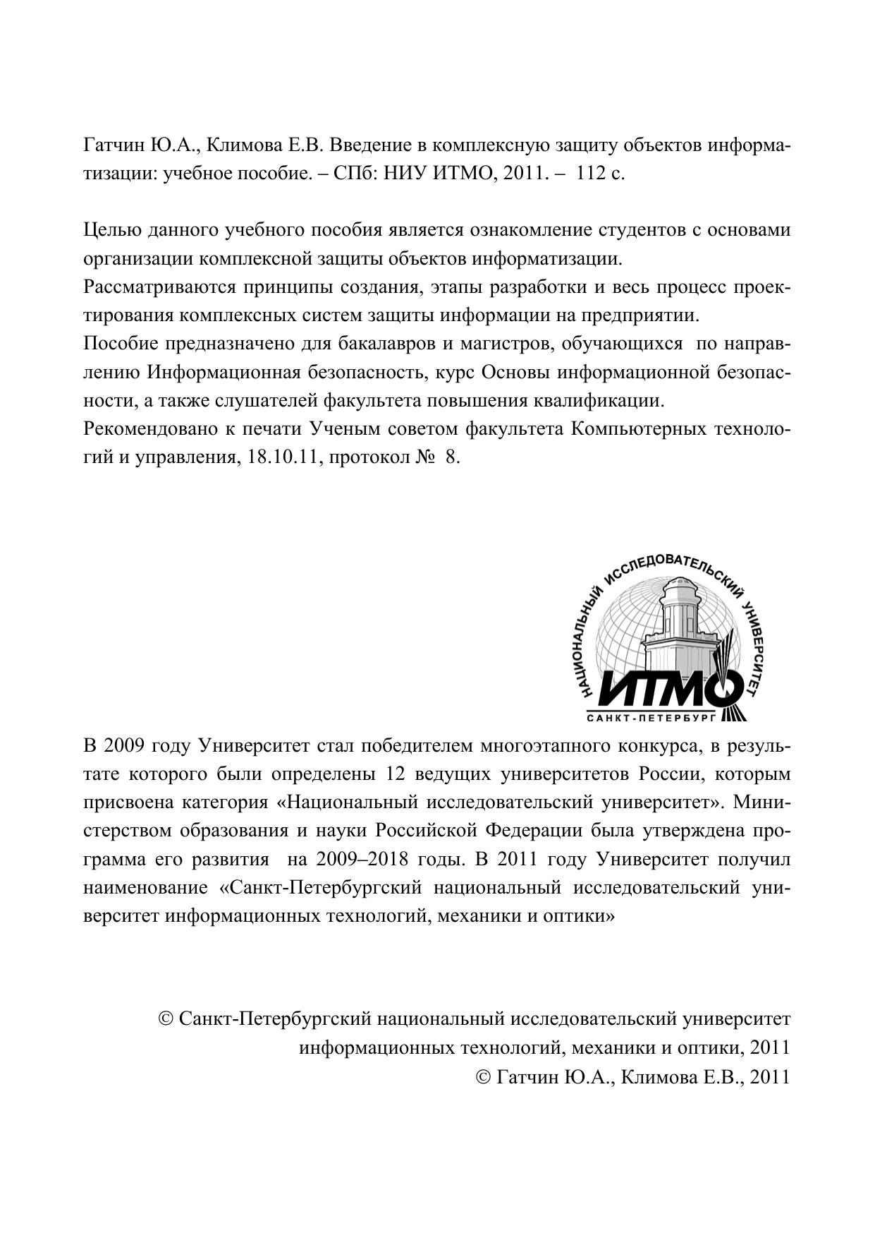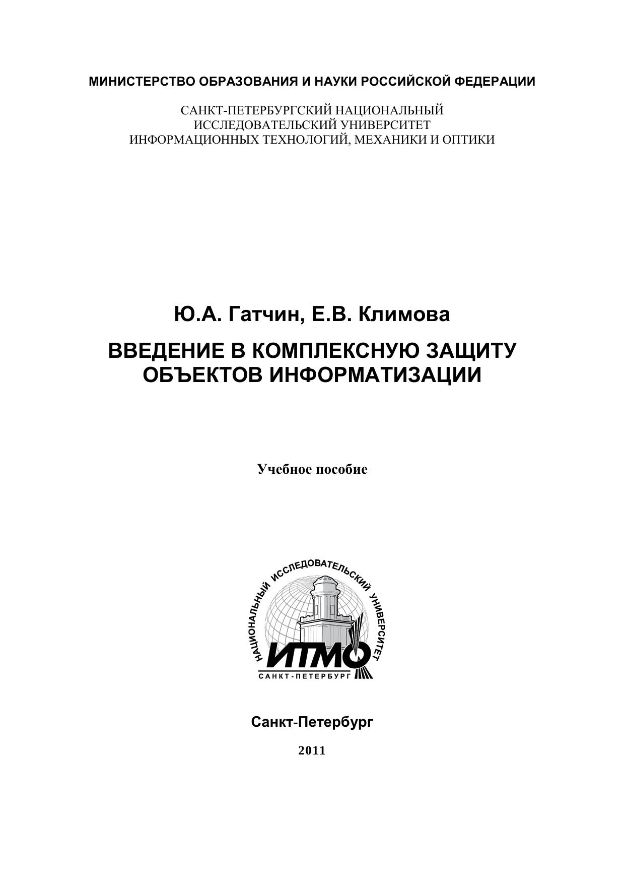 Целью данного учебного пособия является ознакомление студентов с основами организации комплексной защиты объектов информатизации. Рассматриваются принципы создания, этапы разработки и весь процесс проектирования комплексных систем защиты информации на предприятии. Пособие предназначено для бакалавров и магистров, обучающихся по направлению Информационная безопасность, курс Основы информационной безопасности, а также слушателей факультета повышения квалификации. Рекомендовано к печати Ученым советом факультета Компьютерных технологий и управления, 18.10.11, протокол № 8.