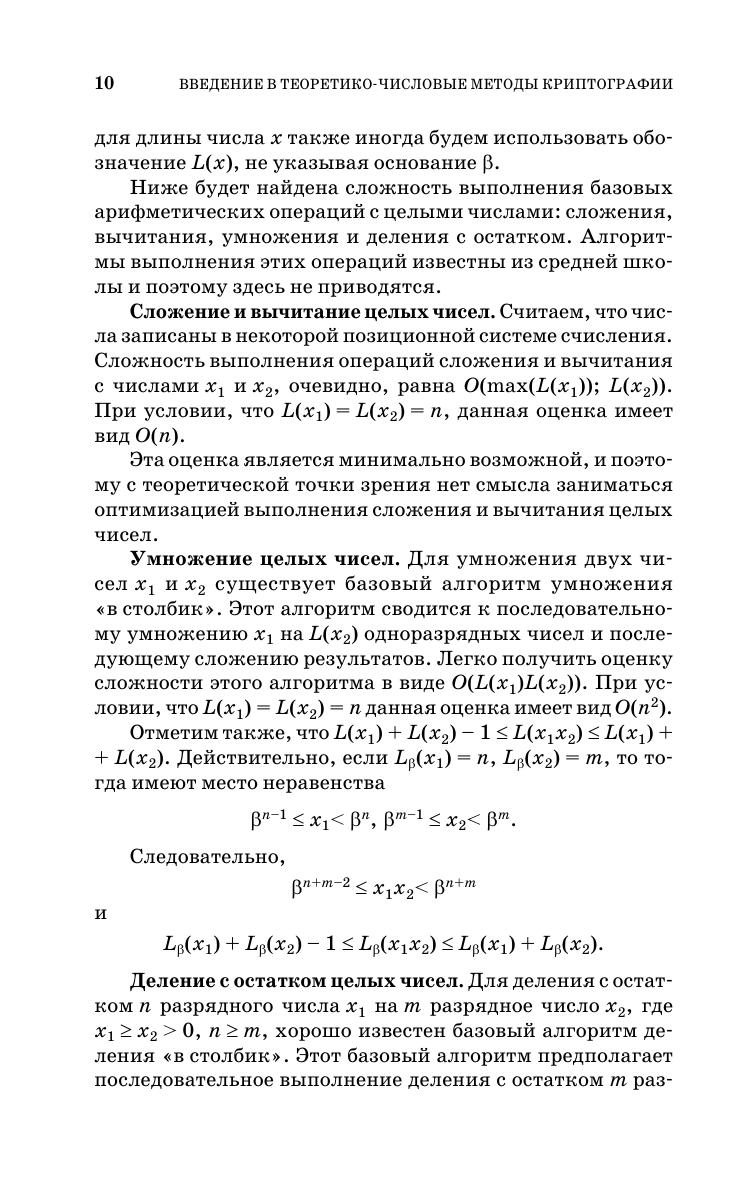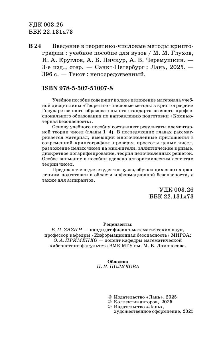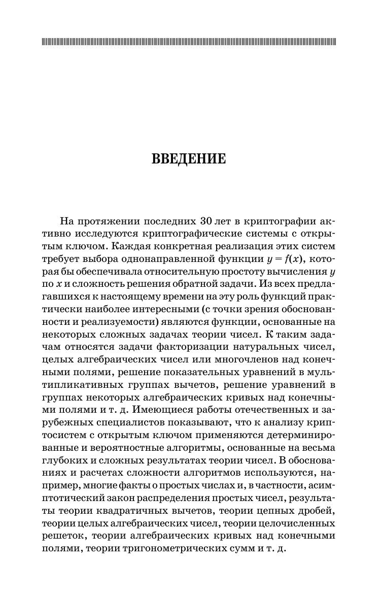 Учебное пособие содержит полное изложение материала учебной дисциплины "Теоретико-числовые методы в криптографии" Государственного образовательного стандарта высшего профессионального образования по направлению подготовки "Компьютерная безопасность". Основу учебного пособия составляют результаты элементарной теории чисел (главы 1-4). В последующих главах рассматривается материал, имеющий многочисленные приложения в современной криптографии: проверка простоты целых чисел, разложение целых чисел на множители, эллиптические кривые, дискретное логарифмирование, теория целочисленных решеток. Особое внимание в пособии уделено алгоритмическим аспектам теории чисел. Предназначено для студентов вузов, обучающихся по направлениям подготовки в области информационной безопасности, а также для аспирантов.