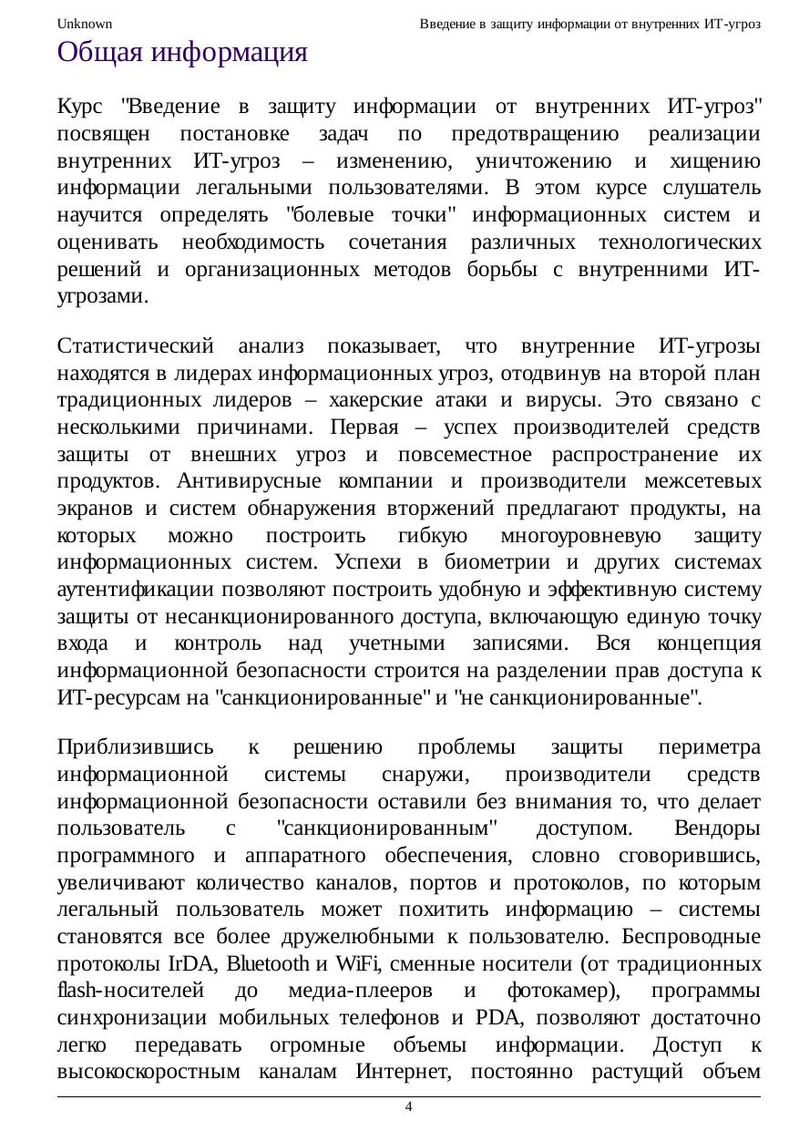 Курс посвящен постановке задач по предотвращению реализации внутренних ИТ- угроз – изменению, уничтожению и хищению информации легальными пользователями. В этом курсе слушатель научится определять "болевые точки" информационных систем и оценивать необходимость сочетания различных технологических решений и организационных методов борьбы с внутренними ИТ-угрозами.