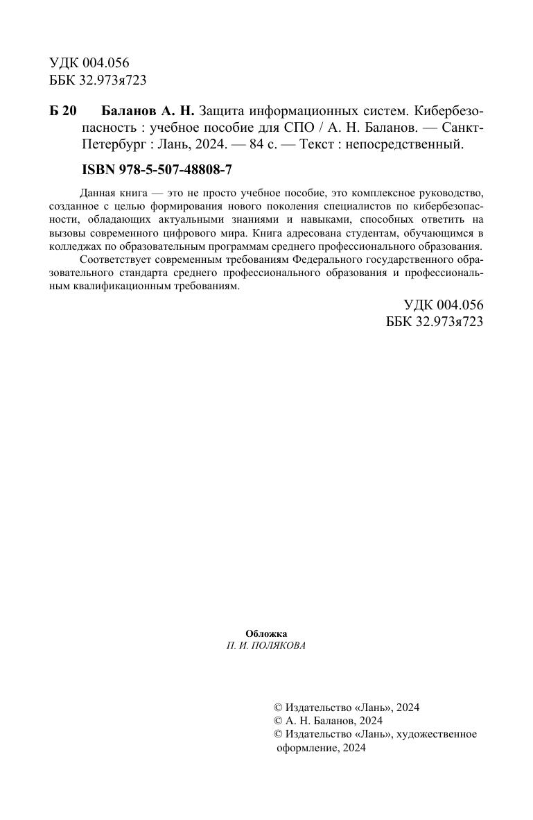 Данная книга — это не просто учебное пособие, это комплексное руководство, созданное с целью формирования нового поколения специалистов по кибербезопасности, обладающих актуальными знаниями и навыками, способных ответить на вызовы современного цифрового мира. Книга адресована студентам, обучающимся в колледжах по образовательным программам среднего профессионального образования. Соответствует современным требованиям Федерального государственного образовательного стандарта среднего профессионального образования и профессиональным квалификационным требованиям.
