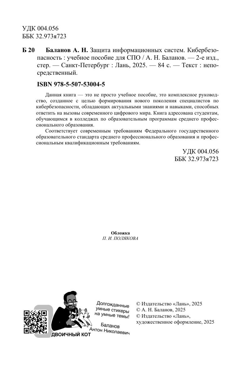 Данная книга — это не просто учебное пособие, это комплексное руководство, созданное с целью формирования нового поколения специалистов по кибербезопасности, обладающих актуальными знаниями и навыками, способных ответить на вызовы современного цифрового мира. Книга адресована студентам, обучающимся в колледжах по образовательным программам среднего профессионального образования. Соответствует современным требованиям Федерального государственного образовательного стандарта среднего профессионального образования и профессиональным квалификационным требованиям.