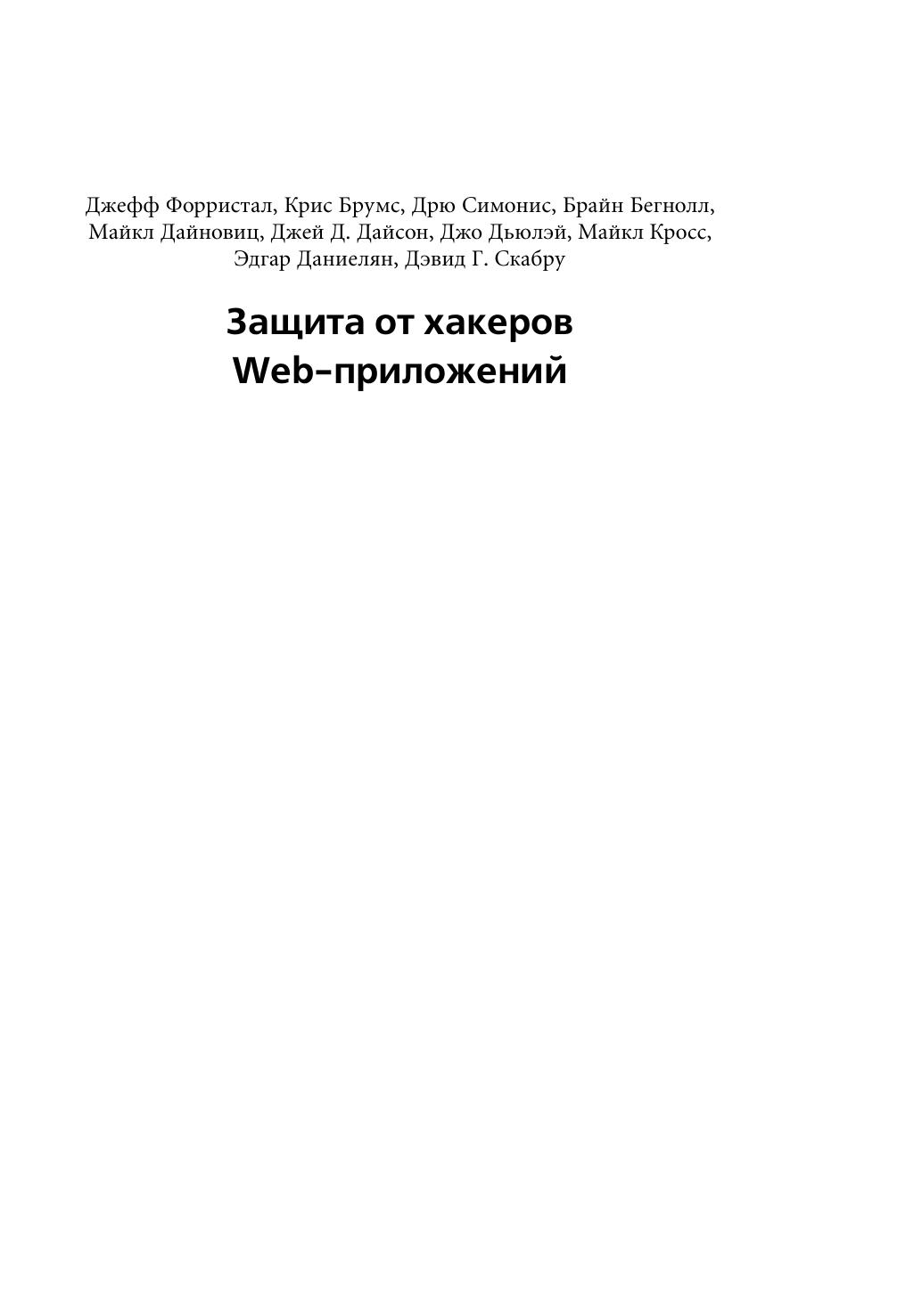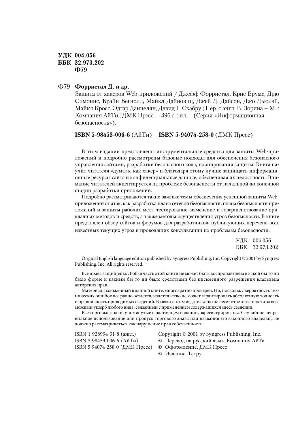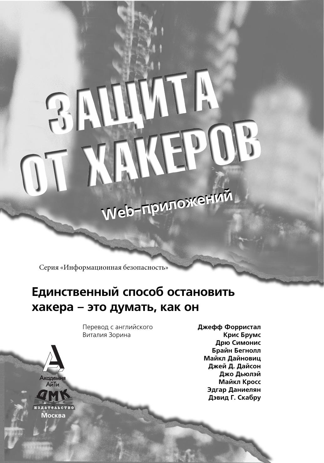 В этом издании представлены инструментальные средства для защиты Web-приложений и подробно рассмотрены базовые подходы для обеспечения безопасного управления сайтами, разработки безопасного кода, планирования защиты. Книга научит читателя «думать, как хакер» и благодаря этому лучше защищать информационные ресурсы сайта и конфиденциальные данные, обеспечивая их целостность. Внимание читателей акцентируется на проблеме безопасности от начальной до конечной стадии разработки приложений. Подробно рассматриваются такие важные темы обеспечения успешной защиты Web-приложений от атак, как разработка плана сетевой безопасности, плана безопасности приложений и защиты рабочих мест, тестирование, изменение и совершенствование прикладных методов и средств, а также методы осуществления угроз безопасности. В книге представлен обзор сайтов и форумов для разработчиков, публикующих перечень всех известных текущих угроз и проводящих консультации по проблемам безопасности.
