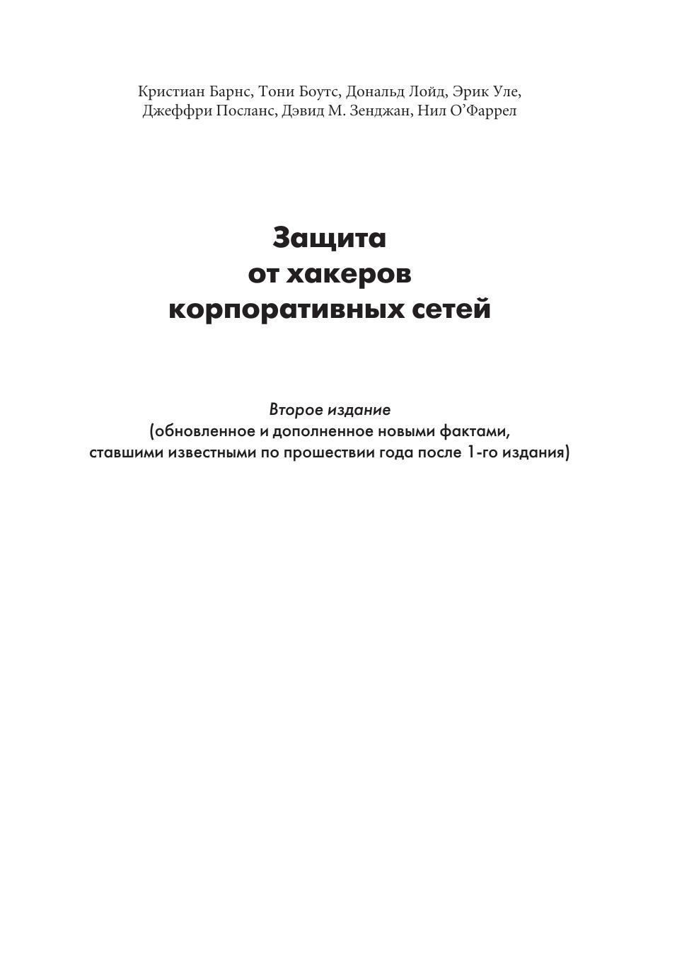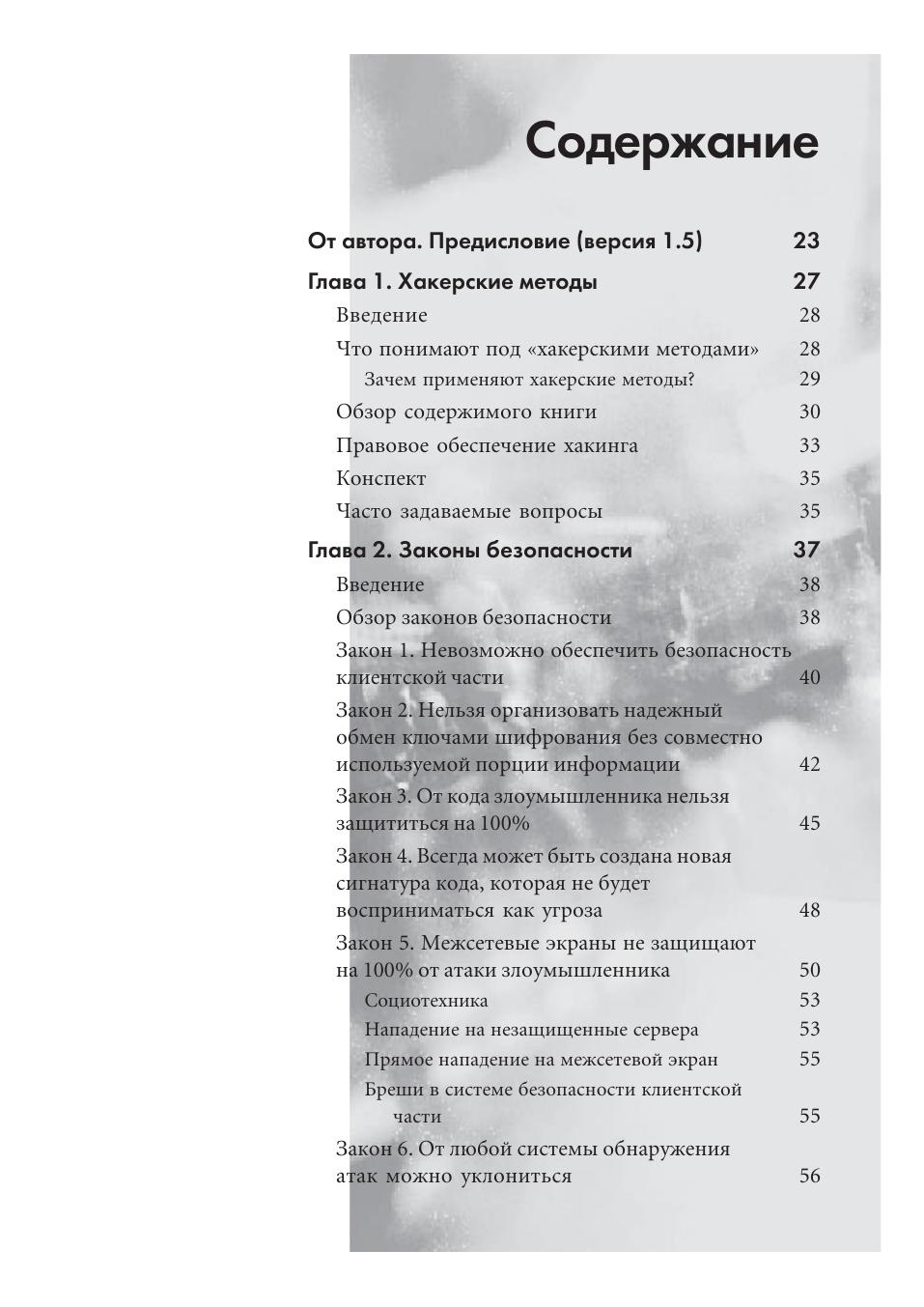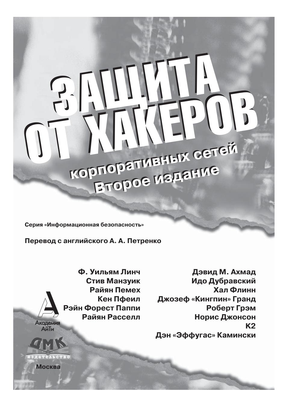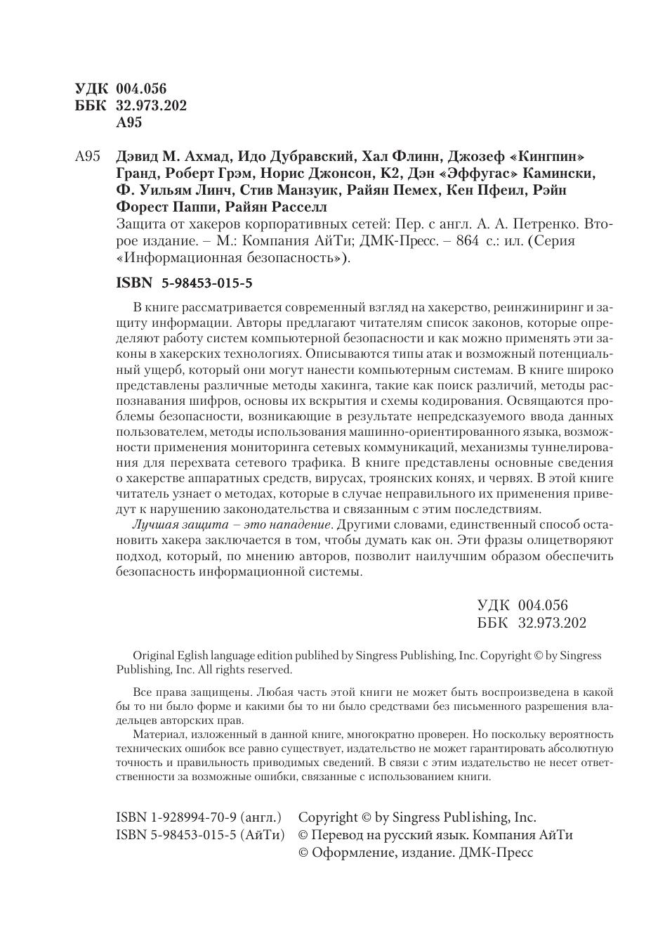 В книге рассматривается современный взгляд на хакерство, реинжиниринг и защиту информации. Авторы предлагают читателям список законов, которые определяют работу систем компьютерной безопасности и как можно применять эти законы в хакерских технологиях. Описываются типы атак и возможный потенциальный ущерб, который они могут нанести компьютерным системам. В книге широко представлены различные методы хакинга, такие как поиск различий, методы распознавания шифров, основы их вскрытия и схемы кодирования. Освящаются проблемы безопасности, возникающие в результате непредсказуемого ввода данных пользователем, методы использования машинно ориентированного языка, возможности применения мониторинга сетевых коммуникаций, механизмы туннелирования для перехвата сетевого трафика. В книге представлены основные сведения о хакерстве аппаратных средств, вирусах, троянских конях, и червях. В этой книге читатель узнает о методах, которые в случае неправильного их применения приведут к нарушению законодательства и связанным с этим последствиям. Лучшая защита – это нападение. Другими словами, единственный способ остановить хакера заключается в том, чтобы думать как он. Эти фразы олицетворяют подход, который, по мнению авторов, позволит наилучшим образом обеспечить безопасность информационной системы.