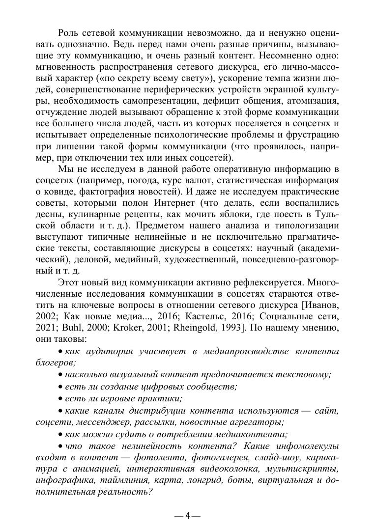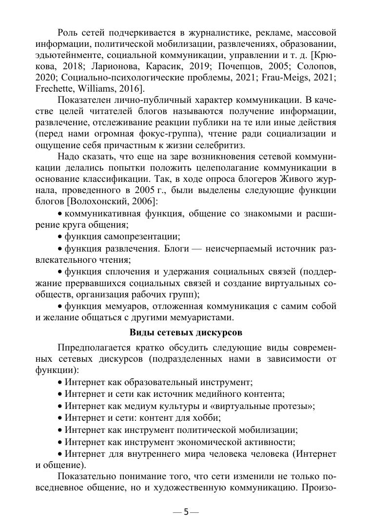 В учебном пособии обсуждаются виды сетевых дискурсов, разделенных в зависимости от функции: академической, коммерческой, медийной, культурно-развлекательной, межличностного общения, автокоммуникации и психологической. Приводятся примеры сетевых дискурсов, обсуждается специфика коммуникации в каждом из них. В пособии анализируется специфика межличностного и языкового общения в блогах в тесной связи с явлением буллинга. Методологией анализа выступает дискурс-анализ текстов языковой личности. Текст учебных разделов пособия сопровождается дополнительной литературой, контрольными вопросами и темами рефератов, что может помочь лучшему освоению стиля новых медиа, поисковых стратегий, стратегий представления контента. Учебное пособие предназначено для подготовки студентов вузов в качестве специалистов в области теории и практики массовой коммуникации – журналистов, специалистов по связям с общественностью, рекламистов, копирайтеров, культурологов.