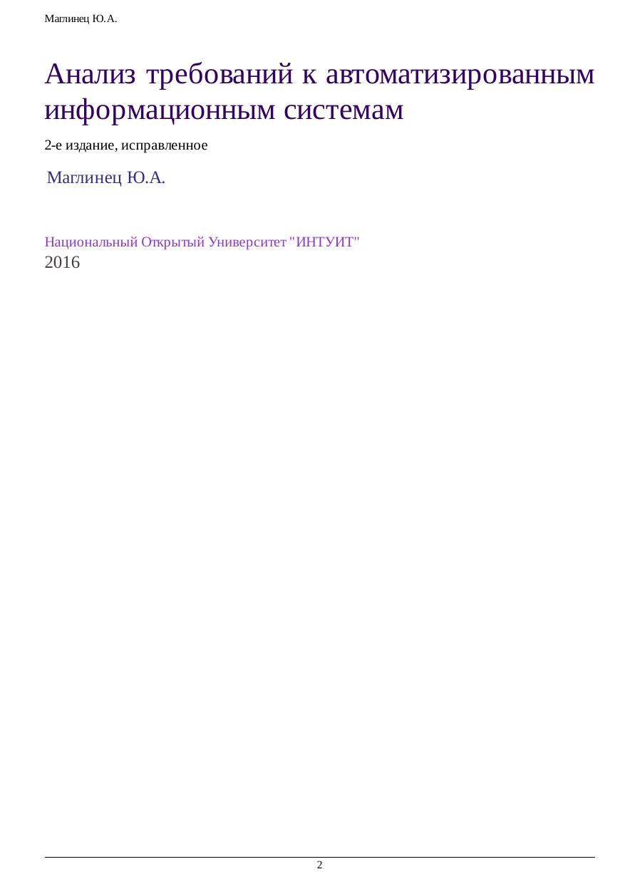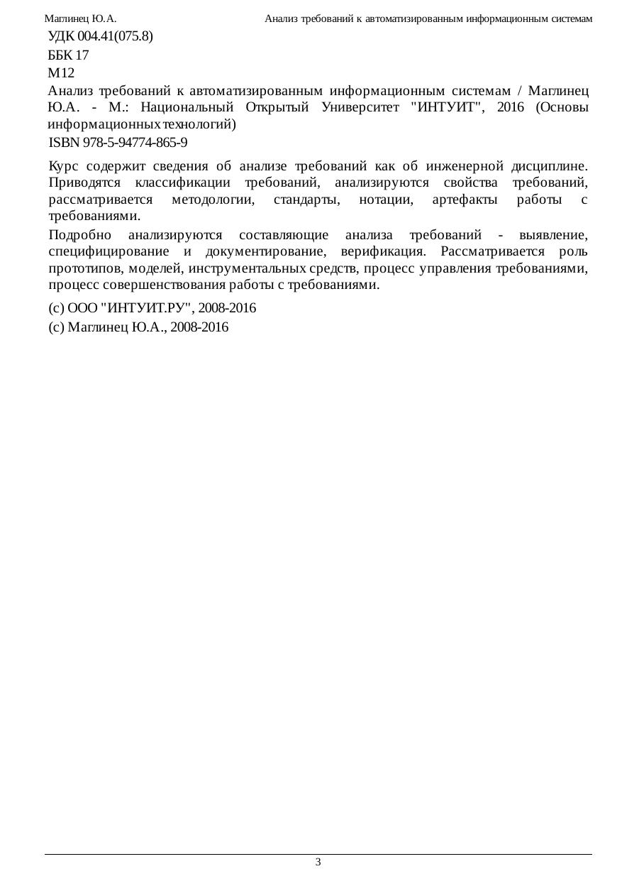 Курс содержит сведения об анализе требований как об инженерной дисциплине. Приводятся классификации требований, анализируются свойства требований, рассматривается методологии, стандарты, нотации, артефакты работы с