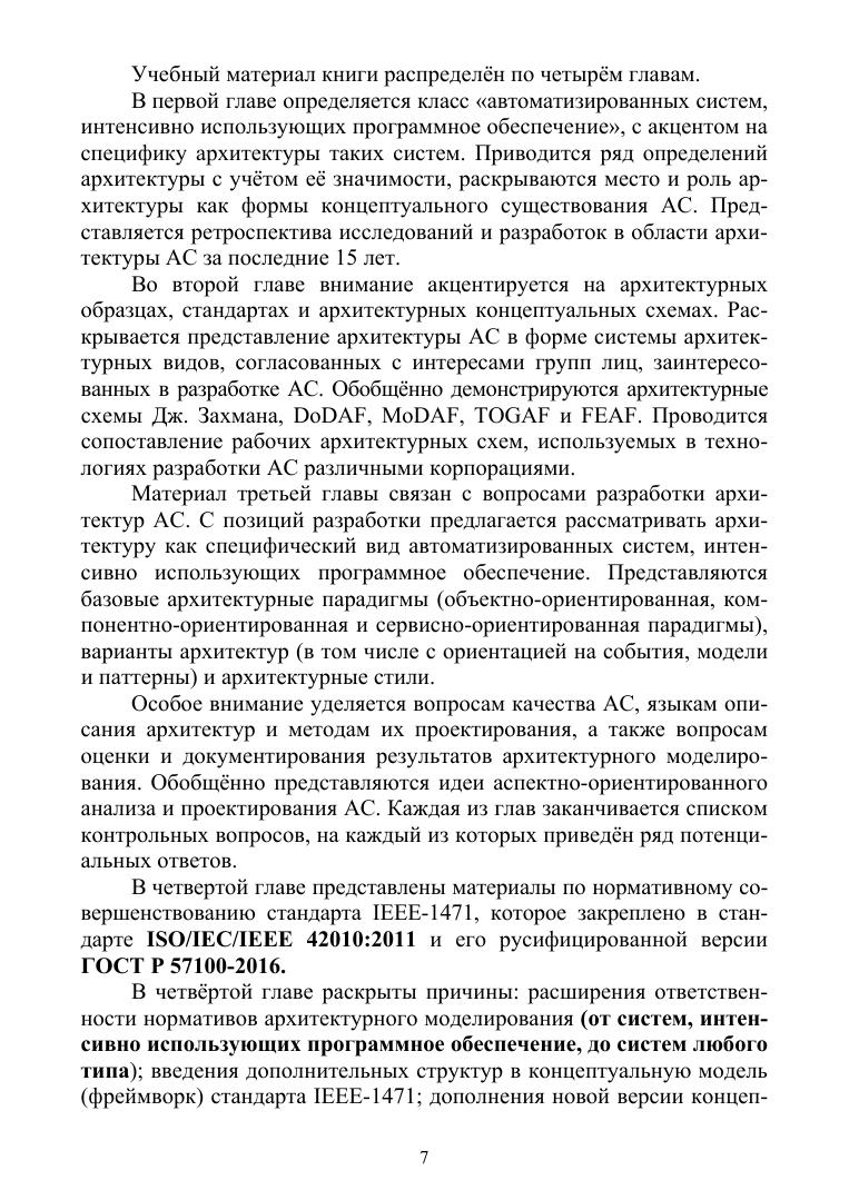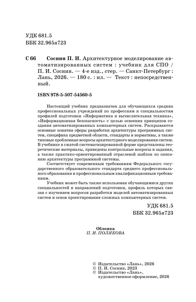 Настоящий учебник предназначен для обучающихся средних профессиональных учреждений по профессиям и специальностям профилей подготовки «Информатика и вычислительная техника», «Информационная безопасность» с целью освоения принципов создания автоматизированных компьютерных систем. Раскрываются основные понятия сферы разработки архитектуры программных систем, специфика предметной области, стандарты и нормативы, а также типовые проблемные вопросы архитектурного моделирования систем. В учебнике в сжатой систематизированной форме представлены теоретические материалы, приведены контрольные вопросы и задания, а также практико-ориентированный отраслевой шаблон по описанию архитектуры программной системы. Соответствует современным требованиям Федерального государственного образовательного стандарта среднего профессионального образования и профессиональным квалификационным требованиям. Учебник может быть также использован обучающимися других специальностей и направлений подготовки, профиль которых связан с изучением вопросов разработки моделей автоматизированных систем и основ проектирования сложных компьютерных систем.