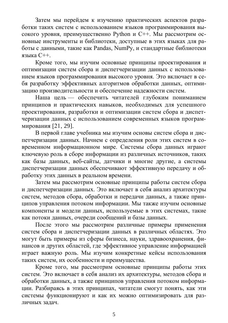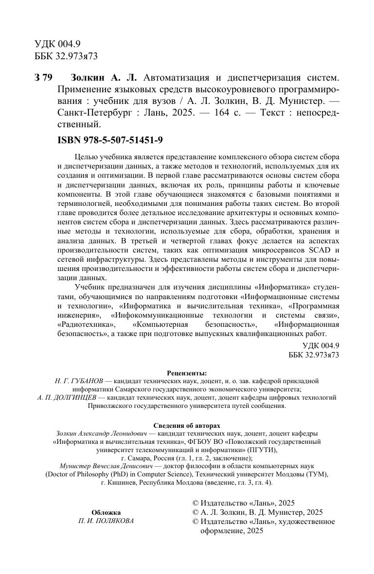 Целью учебника является представление комплексного обзора систем сбора и диспетчеризации данных, а также методов и технологий, используемых для их создания и оптимизации. В первой главе рассматриваются основы систем сбора и диспетчеризации данных, включая их роль, принципы работы и ключевые компоненты. В этой главе обучающиеся знакомятся с базовыми понятиями и терминологией, необходимыми для понимания работы таких систем. Во второй главе проводится более детальное исследование архитектуры и основных компонентов систем сбора и диспетчеризации данных. Здесь рассматриваются различные методы и технологии, используемые для сбора, обработки, хранения и анализа данных. В третьей и четвертой главах фокус делается на аспектах производительности систем, таких как оптимизация микросервисов SCAD и сетевой инфраструктуры. Здесь представлены методы и инструменты для повышения производительности и эффективности работы систем сбора и диспетчеризации данных. Учебник предназначен для изучения дисциплины «Информатика» студентами, обучающимися по направлениям подготовки «Информационные системы и технологии», «Информатика и вычислительная техника», «Программная инженерия», «Инфокоммуникационные технологии и системы связи», «Радиотехника», «Компьютерная безопасность», «Информационная безопасность», а также при подготовке выпускных квалификационных работ.