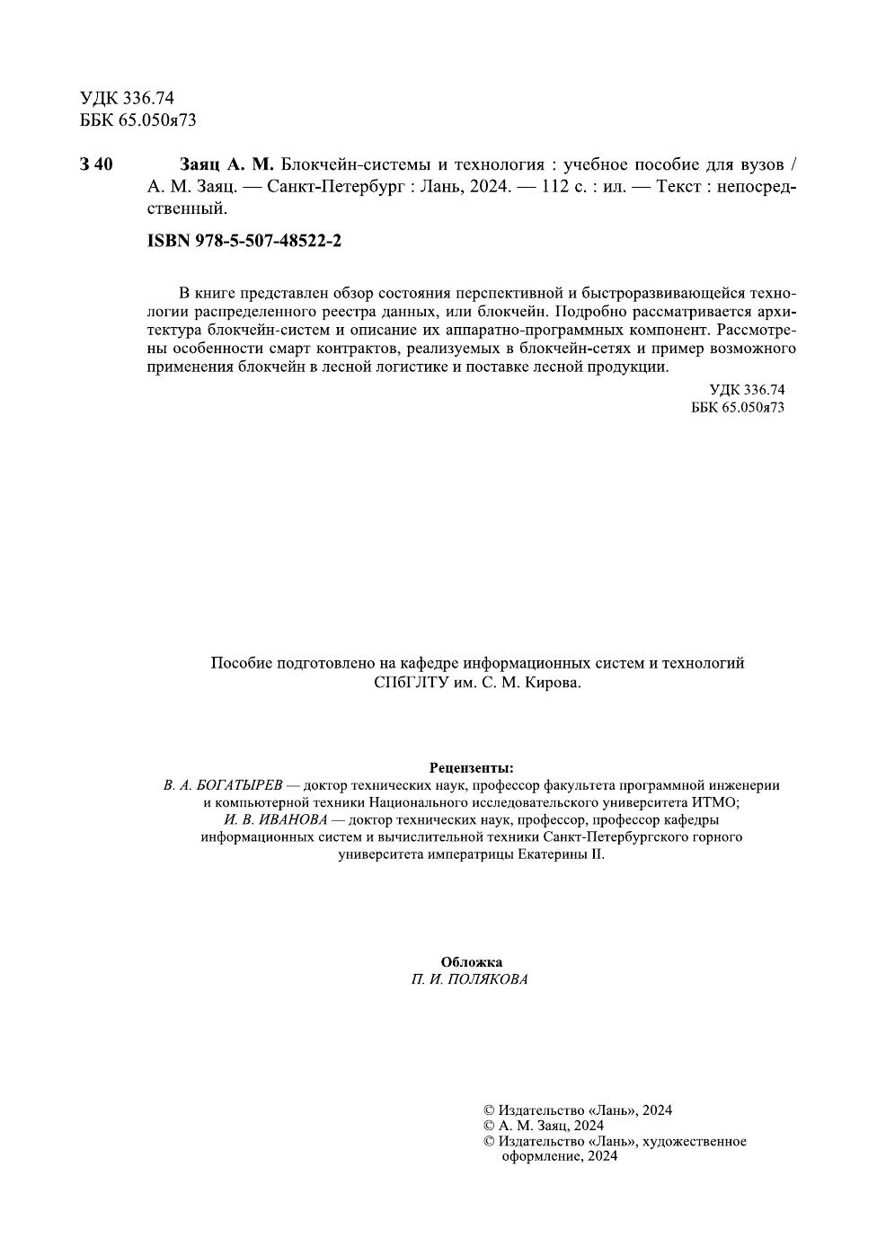 В книге представлен обзор состояния перспективной и быстроразвивающейся технологии распределенного реестра данных, или блокчейн. Подробно рассматривается архитектура блокчейн-систем и описание их аппаратно-программных компонент. Рассмотрены особенности смарт контрактов, реализуемых в блокчейн-сетях и пример возможного применения блокчейн в лесной логистике и поставке лесной продукции