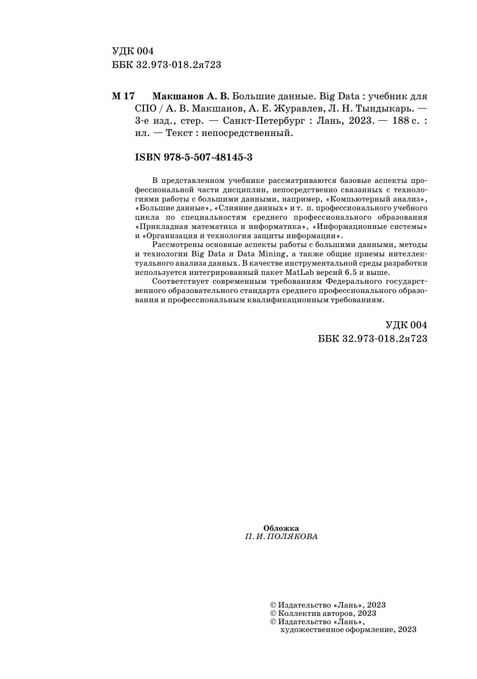 В представленном учебнике рассматриваются базовые аспекты профессиональной части дисциплин, непосредственно связанных с технологиями работы с большими данными, например, Компьютерный анализ, Большие данные, Слияние данных и т. п. профессионального учебного цикла по специальностям среднего профессионального образования Информационные системы и программирование, Информационные системы (по отраслям) и Организация и технология защиты информации. Рассмотрены основные аспекты работы с большими данными, методы и технологии Big Data и Data Mining, а также общие приемы интеллектуального анализа данных. В качестве инструментальной среды разработки используется интегрированный пакет MatLab версий 6.5 и выше. Соответствует современным требованиям Федерального государственного образовательного стандарта среднего профессионального образования и профессиональным квалификационным требованиям.