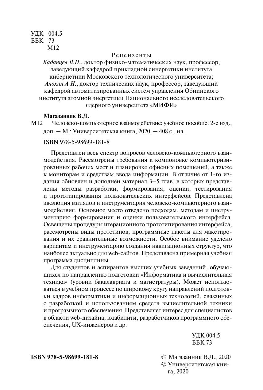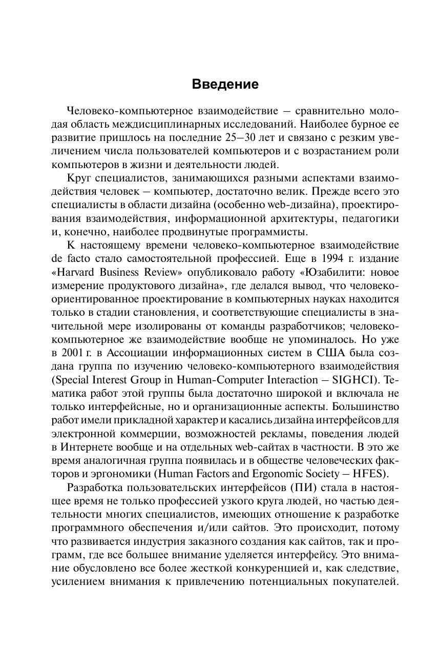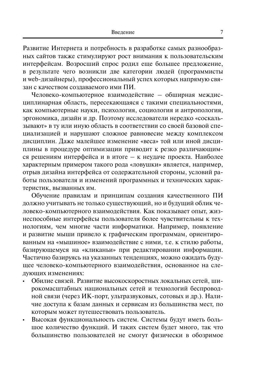 Представлен весь спектр вопросов человеко-компьютерного взаимодействия. Рассмотрены требования к компоновке компьютеризированных рабочих мест и планировке офисных помещений, а также к мониторам и средствам ввода информации. В отличие от 1-го издания обновлен и дополнен материал 3–5 глав, в которых представлены методы разработки, формирования, оценки, тестирования и прототипирования пользовательских интерфейсов. Представлена эволюция взглядов и инструментария человеко-компьютерного взаимодействия. Основное место отведено подходам, методам и инструментарию формирования и оценки пользовательского интерфейса. Освещены процедуры итерационного прототипирования интерфейса, рассмотрены виды прототипов, программные пакеты для макетирования и их сравнительные возможности. Особое внимание уделено вариантам и инструментарию создания навигационных структур, что наиболее актуально для web-сайтов. Представлена примерная учебная программа дисциплины. Для студентов и аспирантов высших учебных заведений, обучающихся по направлению подготовки «Информатика и вычислительная техника» (уровни бакалавриата и магистратуры). Может использоваться в учебном процессе по широкому кругу направлений подготов-ки кадров информатики и информационных технологий, связанных с разработкой и использованием средств вычислительной техники и программного обеспечения. Представляет интерес для специалистов в области web-дизайна, юзабилити, разработчиков программного обеспечения, UX-инженеров и др.