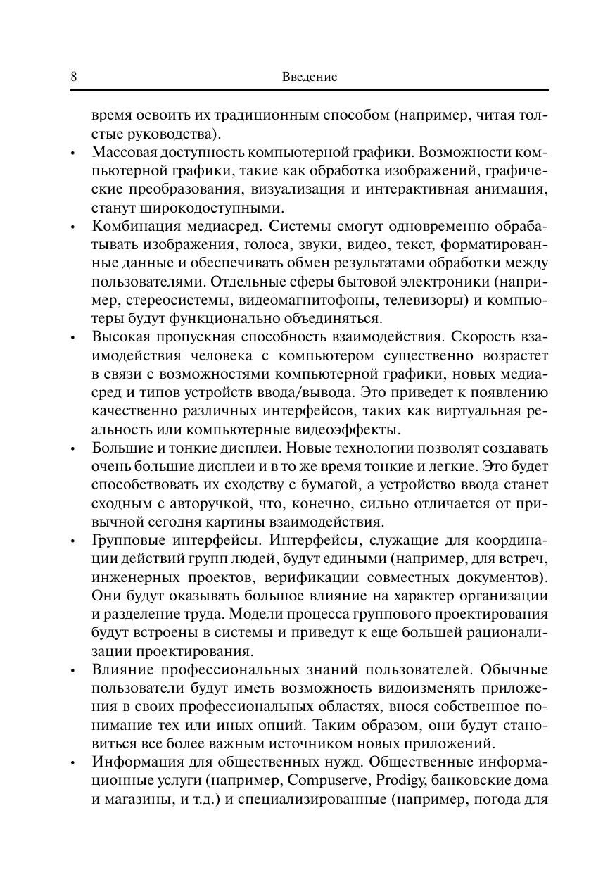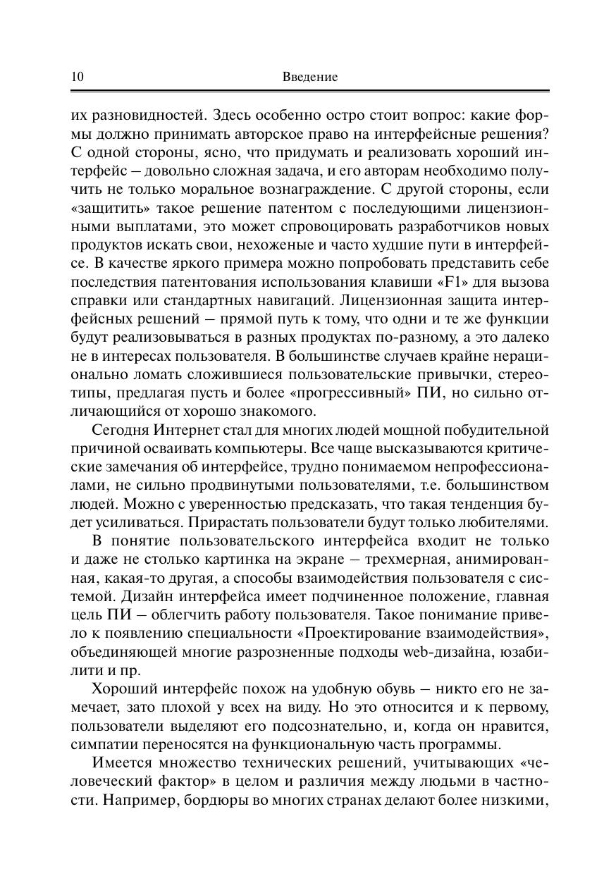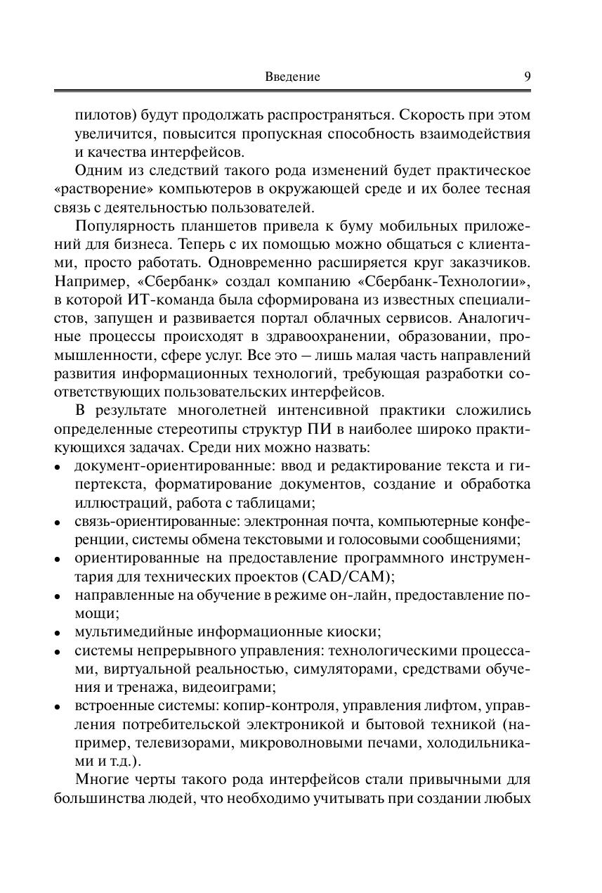 Представлен весь спектр вопросов человеко-компьютерного взаимодействия. Рассмотрены требования к компоновке компьютеризированных рабочих мест и планировке офисных помещений, а также к мониторам и средствам ввода информации. В отличие от 1-го издания обновлен и дополнен материал 3–5 глав, в которых представлены методы разработки, формирования, оценки, тестирования и прототипирования пользовательских интерфейсов. Представлена эволюция взглядов и инструментария человеко-компьютерного взаимодействия. Основное место отведено подходам, методам и инструментарию формирования и оценки пользовательского интерфейса. Освещены процедуры итерационного прототипирования интерфейса, рассмотрены виды прототипов, программные пакеты для макетирования и их сравнительные возможности. Особое внимание уделено вариантам и инструментарию создания навигационных структур, что наиболее актуально для web-сайтов. Представлена примерная учебная программа дисциплины. Для студентов и аспирантов высших учебных заведений, обучающихся по направлению подготовки «Информатика и вычислительная техника» (уровни бакалавриата и магистратуры). Может использоваться в учебном процессе по широкому кругу направлений подготов-ки кадров информатики и информационных технологий, связанных с разработкой и использованием средств вычислительной техники и программного обеспечения. Представляет интерес для специалистов в области web-дизайна, юзабилити, разработчиков программного обеспечения, UX-инженеров и др.