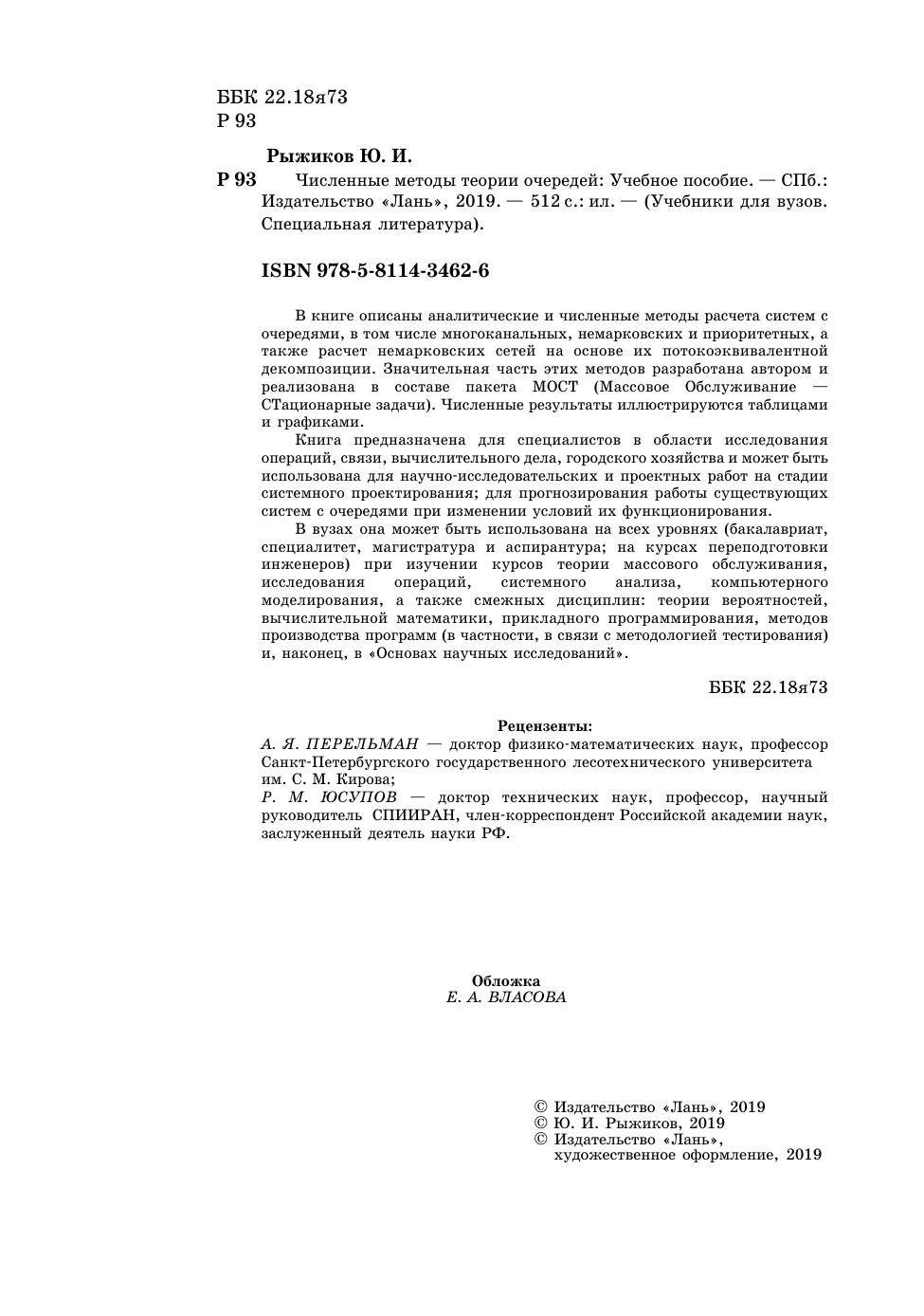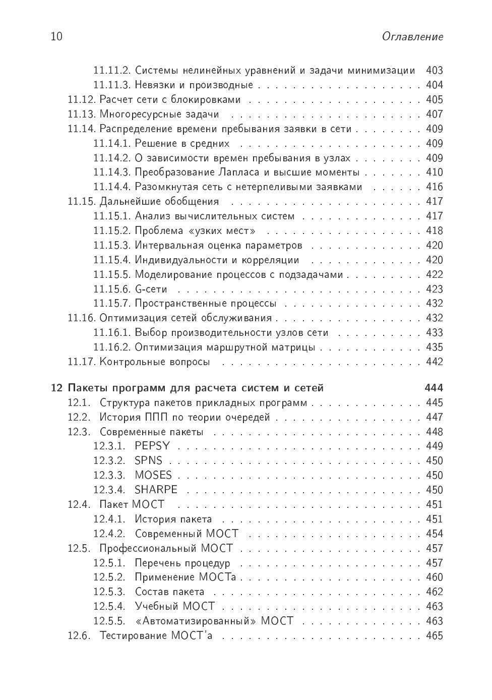 В книге описаны аналитические и численные методы расчета систем с очередями, в том числе многоканальных, немарковских и приоритетных, а также расчет немарковских сетей на основе их потокоэквивалентной декомпозиции. Значительная часть этих методов разработана автором и реализована в составе пакета МОСТ (Массовое Обслуживание — СТационарные задачи). Численные результаты иллюстрируются таблицами и графиками.