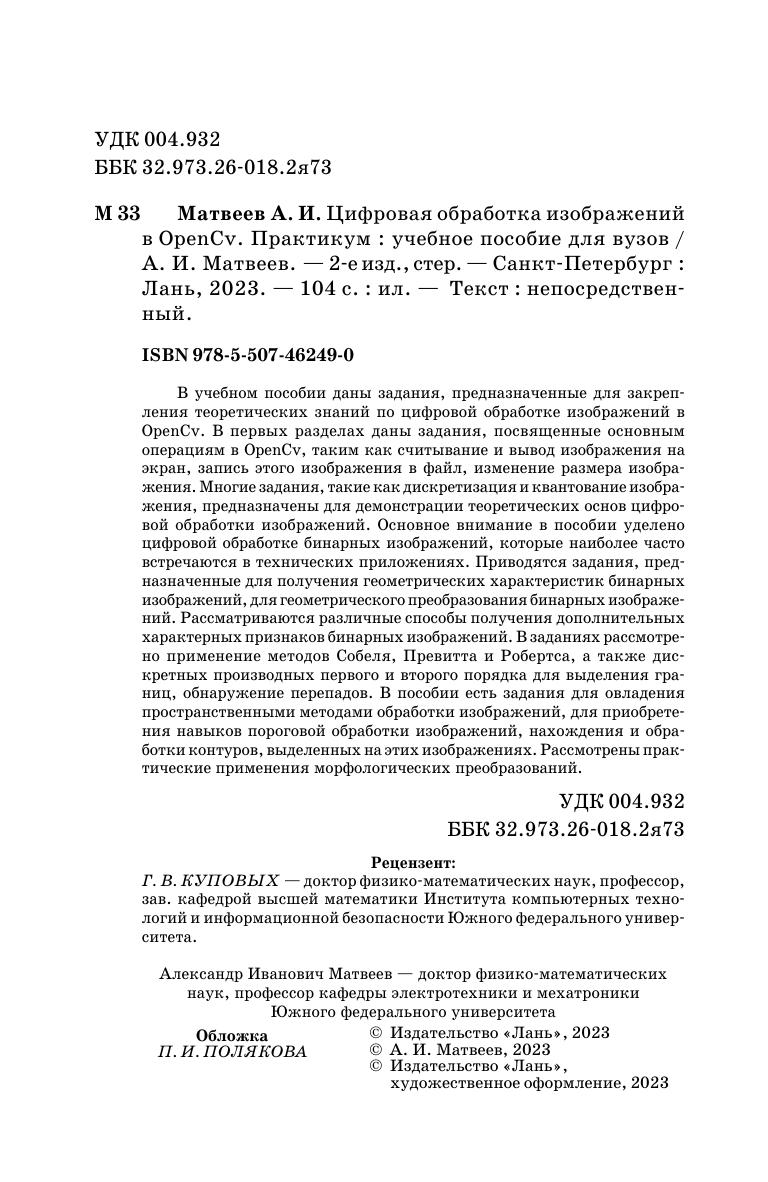 В учебном пособии даны задания, предназначенные для закрепления теоретических знаний по цифровой обработке изображений в OpenCv. В первых разделах даны задания, посвященные основным операциям в OpenCv, таким как считывание и вывод изображения на экран, запись этого изображения в файл, изменение размера изображения. Многие задания, такие как дискретизация и квантование изображения, предназначены для демонстрации теоретических основ цифровой обработки изображений. Основное внимание в пособии уделено цифровой обработке бинарных изображений, которые наиболее часто встречаются в технических приложениях. Приводятся задания, предназначенные для получения геометрических характеристик бинарных изображений, для геометрического преобразования бинарных изображений. Рассматриваются различные способы получения дополнительных характерных признаков бинарных изображений. В заданиях рассмотрено применение методов Собеля, Превитта и Робертса, а также дискретных производных первого и второго порядка для выделения границ, обнаружение перепадов. В пособии есть задания для овладения пространственными методами обработки изображений, для приобретения навыков пороговой обработки изображений, нахождения и обработки контуров, выделенных на этих изображениях. Рассмотрены практические применения морфологических преобразований.