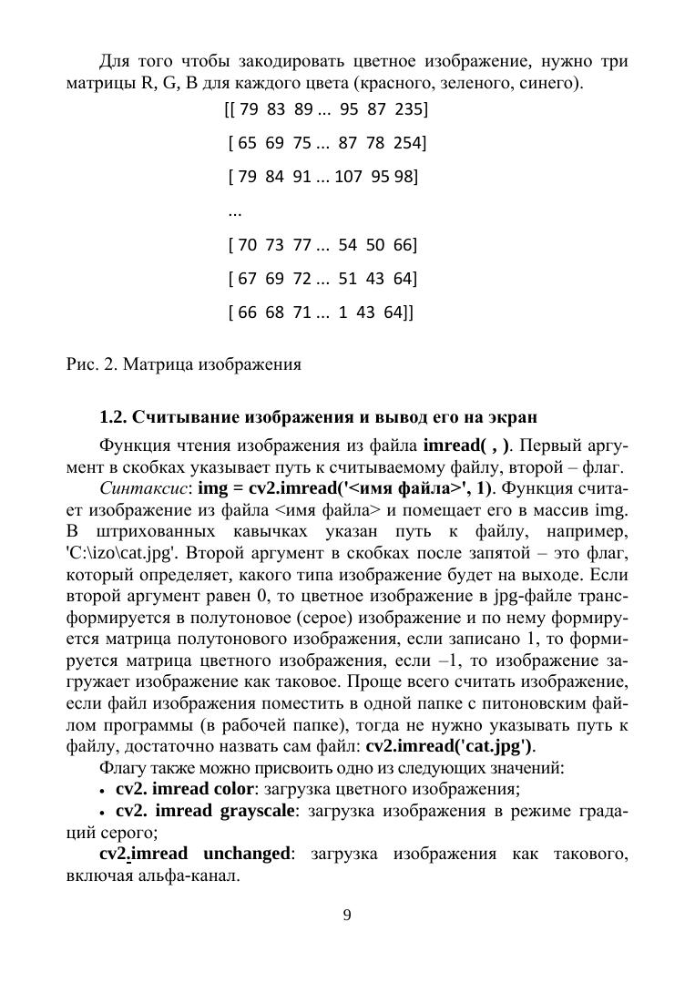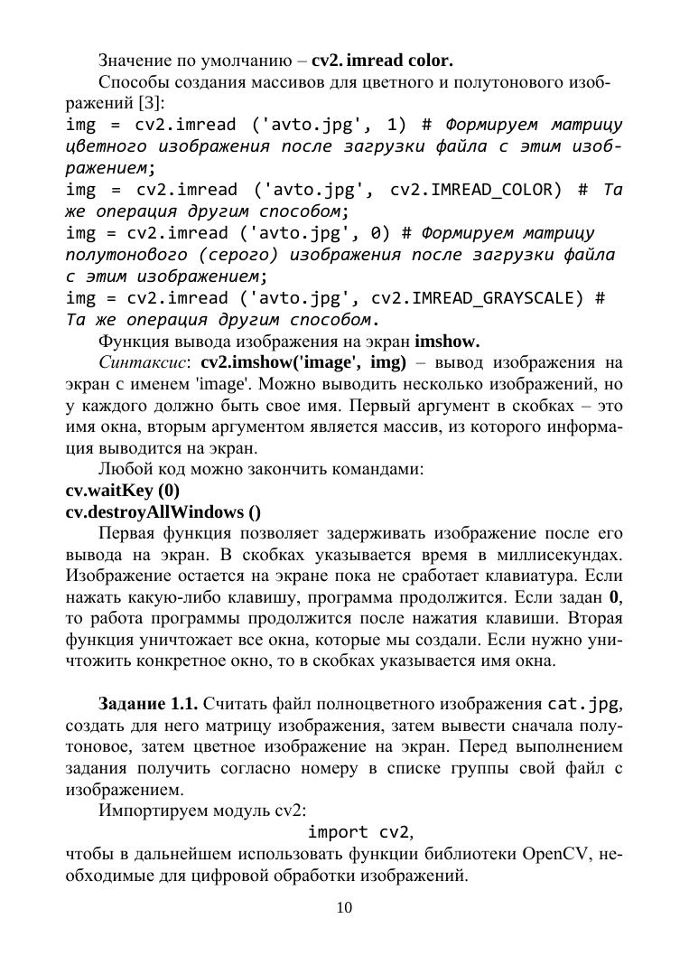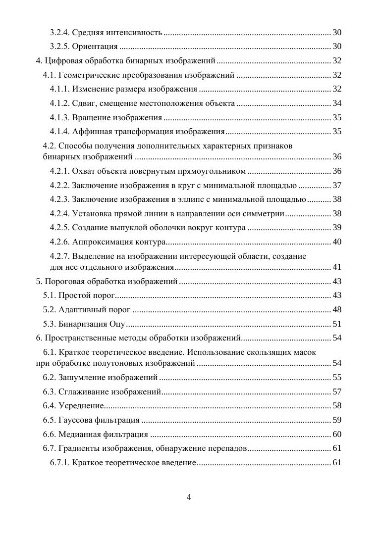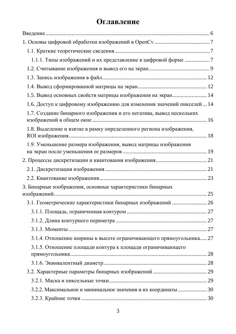 В учебном пособии даны задания, предназначенные для закрепления теоретических знаний по цифровой обработке изображений в OpenCv. В первых разделах даны задания, посвященные основным операциям в OpenCv, таким как считывание и вывод изображения на экран, запись этого изображения в файл, изменение размера изображения. Многие задания, такие как дискретизация и квантование изображения, предназначены для демонстрации теоретических основ цифровой обработки изображений. Основное внимание в пособии уделено цифровой обработке бинарных изображений, которые наиболее часто встречаются в технических приложениях. Приводятся задания, предназначенные для получения геометрических характеристик бинарных изображений, для геометрического преобразования бинарных изображений. Рассматриваются различные способы получения дополнительных характерных признаков бинарных изображений. В заданиях рассмотрено применение методов Собеля, Превитта и Робертса, а также дискретных производных первого и второго порядка для выделения границ, обнаружение перепадов. В пособии есть задания для овладения пространственными методами обработки изображений, для приобретения навыков пороговой обработки изображений, нахождения и обработки контуров, выделенных на этих изображениях. Рассмотрены практические применения морфологических преобразований.
