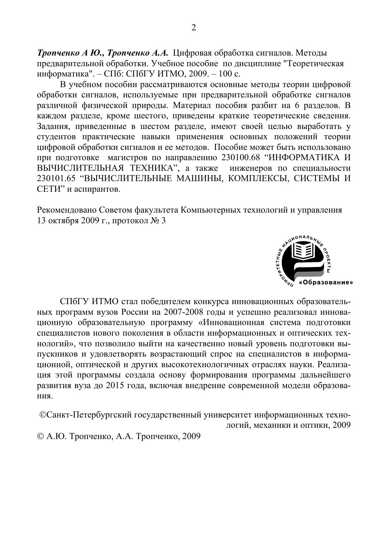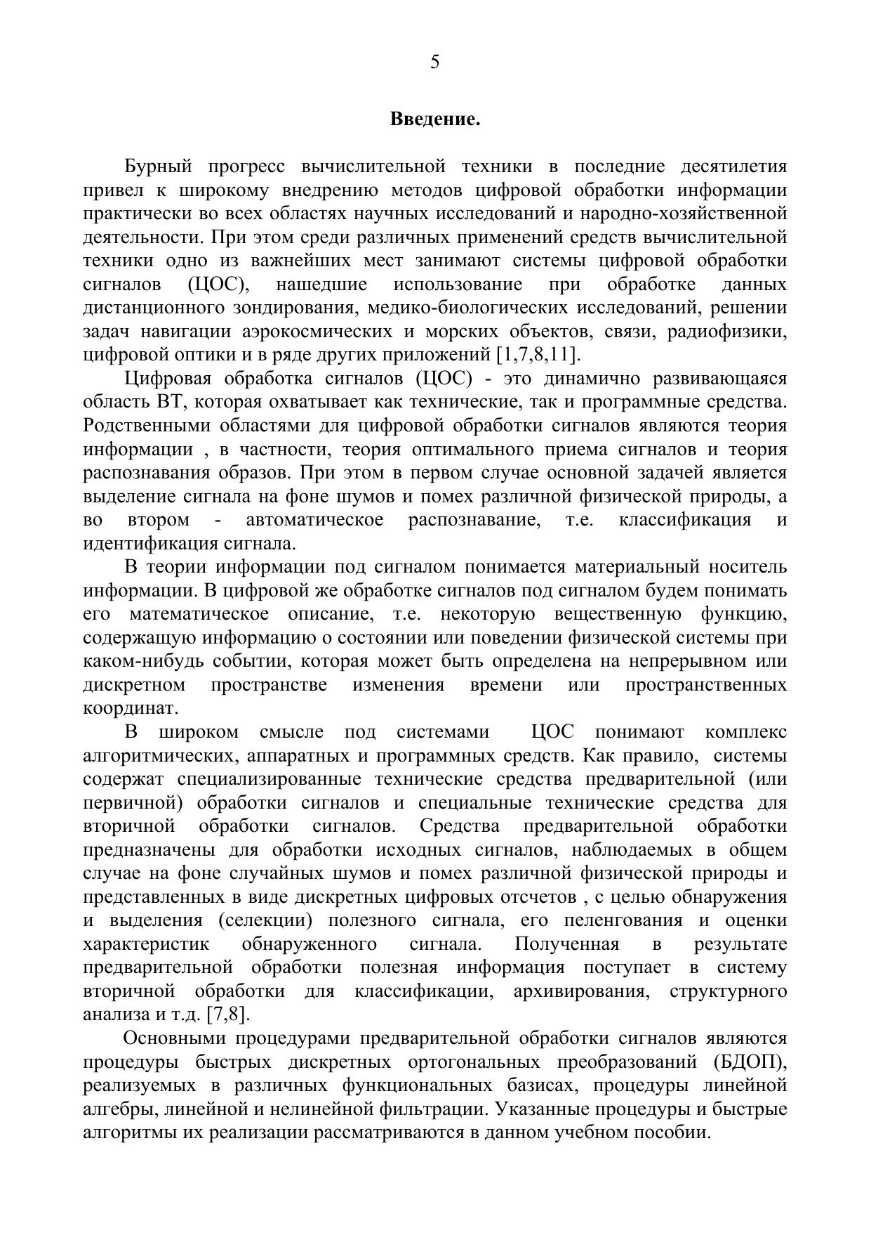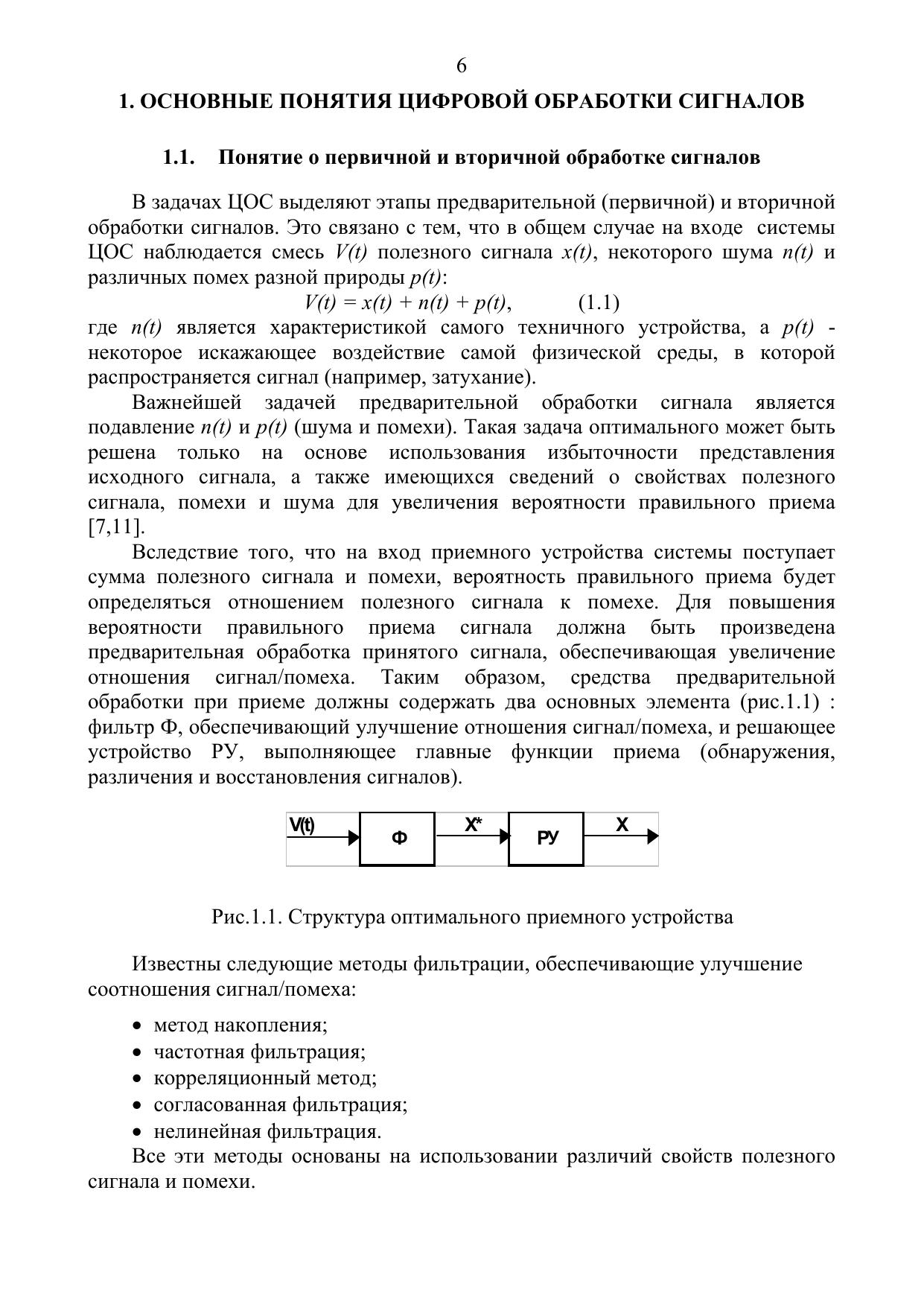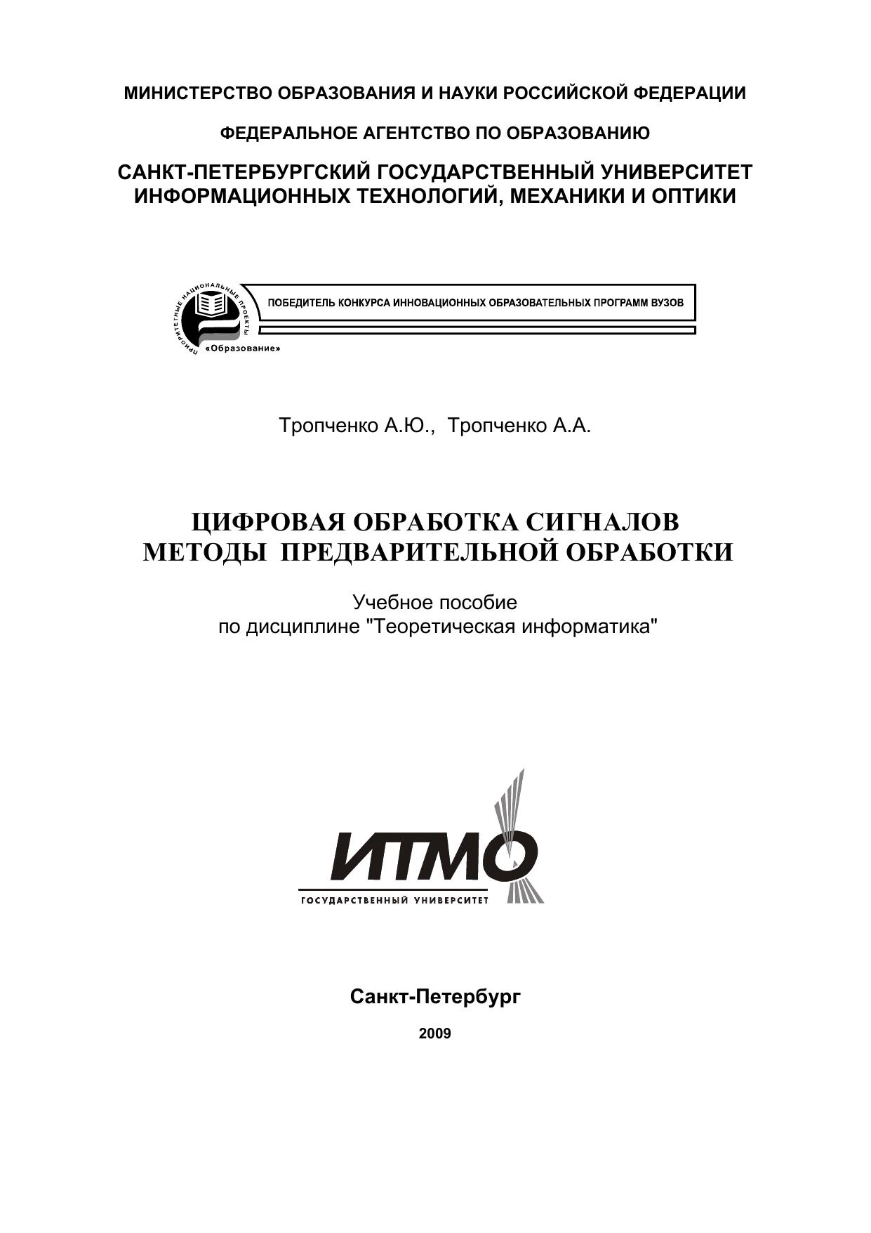 В учебном пособии рассматриваются основные методы теории цифровой обработки сигналов, используемые при предварительной обработке сигналов различной физической природы. Материал пособия разбит на 6 разделов. В каждом разделе, кроме шестого, приведены краткие теоретические сведения. Задания, приведенные в шестом разделе, имеют своей целью выработать у студентов практические навыки применения основных положений теории цифровой обработки сигналов и ее методов.