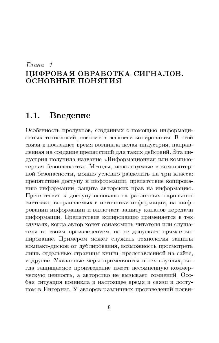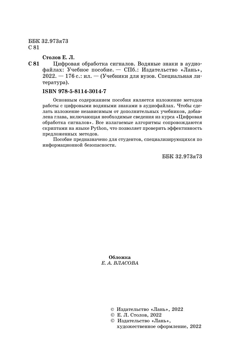 Основным содержанием пособия является изложение методов работы с цифровыми водяными знаками в аудиофайлах. Чтобы сделать изложение независимым от дополнительных учебников, добавлена глава, включающая необходимые сведения из курса «Цифровая обработка сигналов». Все излагаемые алгоритмы сопровождаются скриптами на языке Python, что позволяет проверить эффективность предложенных методов. Пособие предназначено для студентов, специализирующихся по информационной безопасности.
