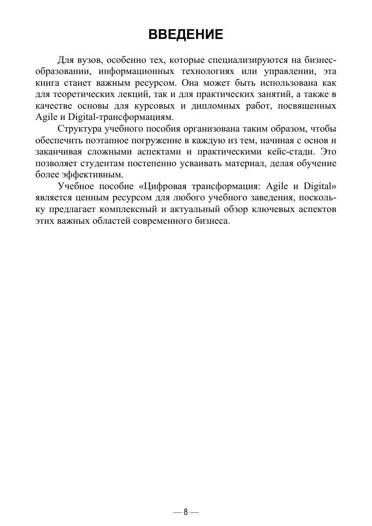 Это учебное пособие представляет собой комплексный ресурс, посвященный двум ключевым направлениям современной бизнес-трансформации: Agile и Digital. Автором подробно разбираются основы, стратегии и практическое применение этих методологий, что делает книгу неоценимым источником знаний для студентов и специалистов, желающих глубже погрузиться в данные темы. Темы, охватываемые в учебном пособии, включают в себя основы Agile-методологии, технологические аспекты Digital-трансформации, управление изменениями, роль лидерства, интеграцию Agile в корпоративную культуру, разработку цифровых стратегий и бизнес-моделей и многие другие. Особое внимание уделяется практическому применению теоретических знаний, что делает книгу актуальной не только для студентов, но и для практикующих специалистов.