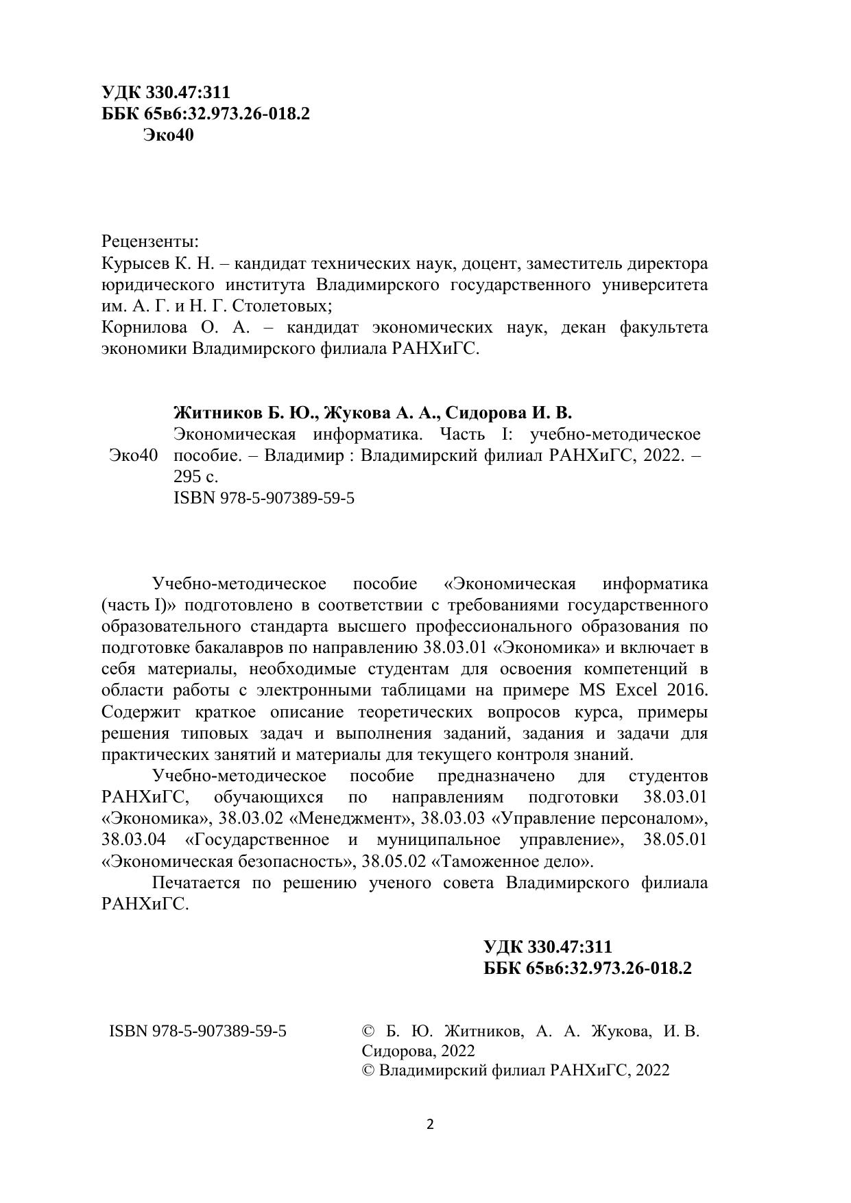 Учебно-методическое пособие «Экономическая информатика (часть I)» подготовлено в соответствии с требованиями государственного образовательного стандарта высшего профессионального образования по подготовке бакалавров по направлению 38.03.01 «Экономика» и включает в себя материалы, необходимые студентам для освоения компетенций в области работы с электронными таблицами на примере MS Excel 2016. Содержит краткое описание теоретических вопросов курса, примеры решения типовых задач и выполнения заданий, задания и задачи для практических занятий и материалы для текущего контроля знаний. Учебно-методическое пособие предназначено для студентов РАНХиГС, обучающихся по направлениям подготовки 38.03.01 «Экономика», 38.03.02 «Менеджмент», 38.03.03 «Управление персоналом», 38.03.04 «Государственное и муниципальное управление», 38.05.01 «Экономическая безопасность», 38.05.02 «Таможенное дело». Печатается по решению ученого совета Владимирского филиала РАНХиГС.