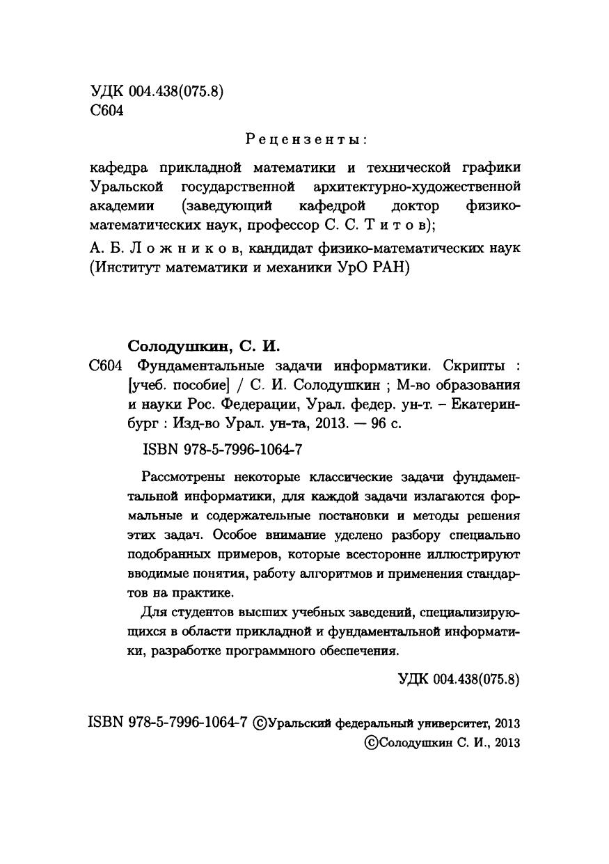 Рассмотрены некоторые классические задачи фундаментальной информатики, для каждой задачи излагаются формальные и содержательные постановки и методы решения этих задач. Особое внимание уделено разбору специально подобранных примеров, которые всесторонне иллюстрируют вводимые понятия, работу алгоритмов и применения стандартов на практике. Для студентов высших учебных заведений, специализирующихся в области прикладной и фундаментальной информатики, разработке программного обеспечения.
