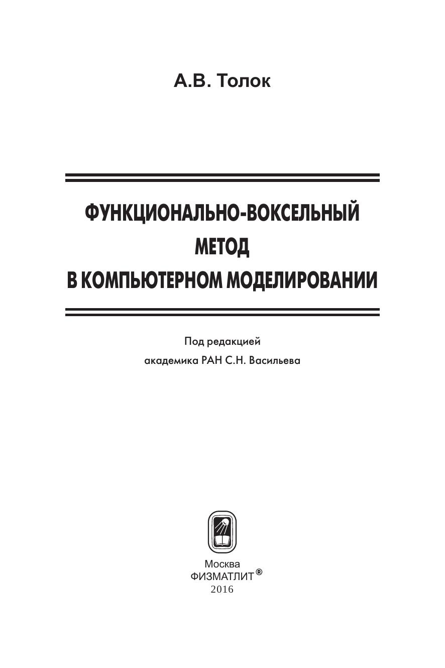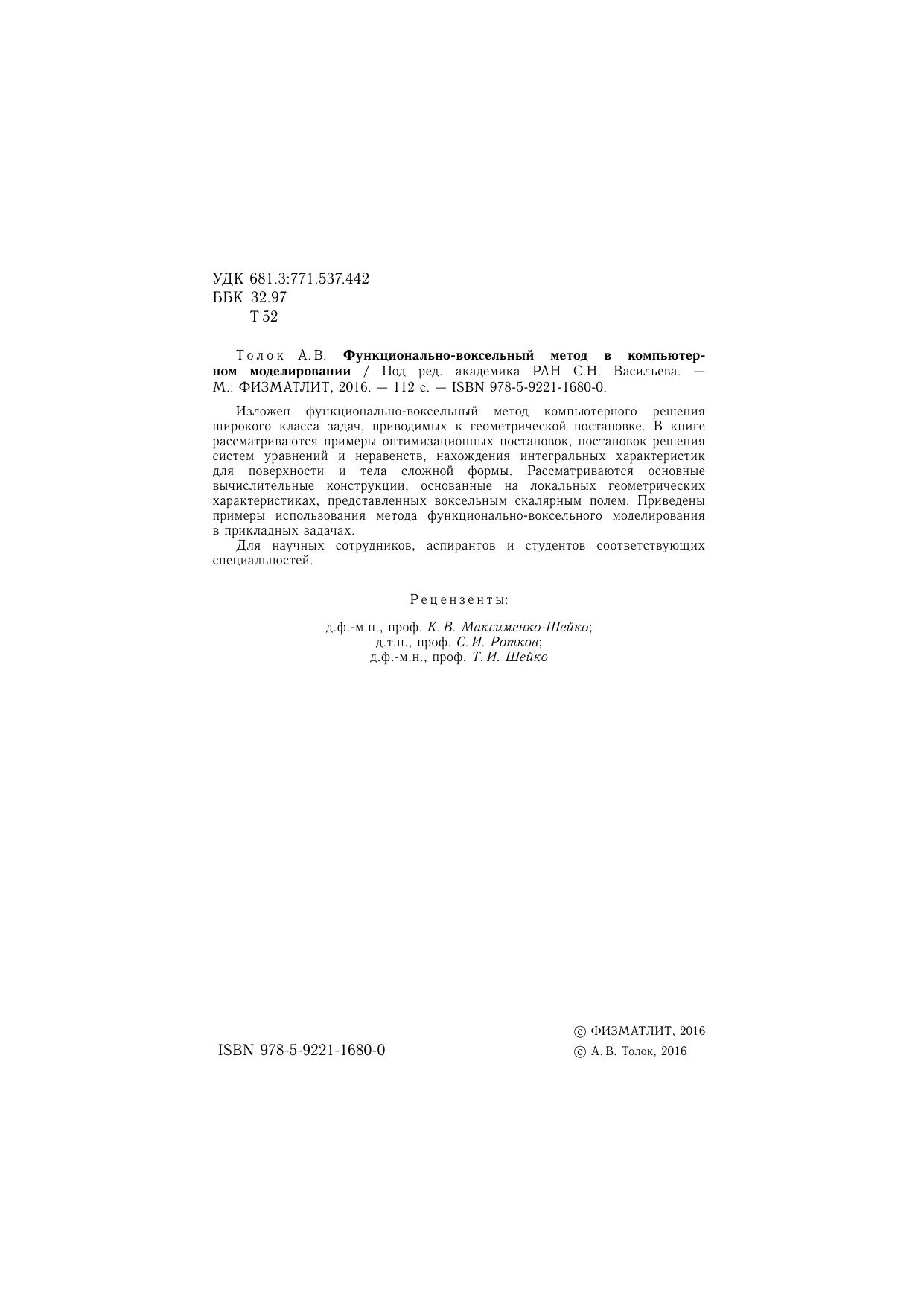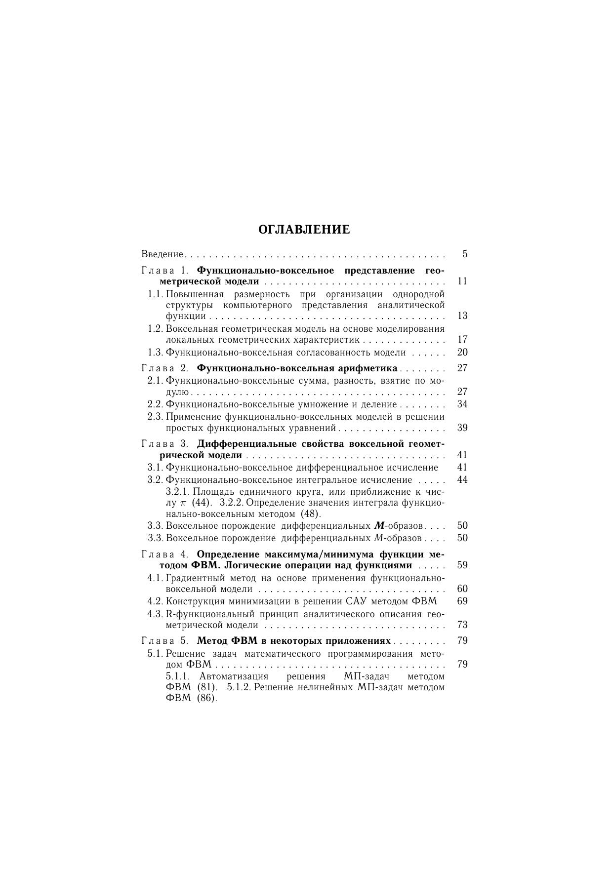 Изложен функционально-воксельный метод компьютерного решения широкого класса задач, приводимых к геометрической постановке. В книге рассматриваются примеры оптимизационных постановок, постановок решения систем уравнений и неравенств, нахождения интегральных характеристик для поверхности и тела сложной формы. Рассматриваются основные вычислительные конструкции, основанные на локальных геометрических характеристиках, представленных воксельным скалярным полем. Приведены примеры использования метода функционально воксельного моделирования в прикладных задачах.