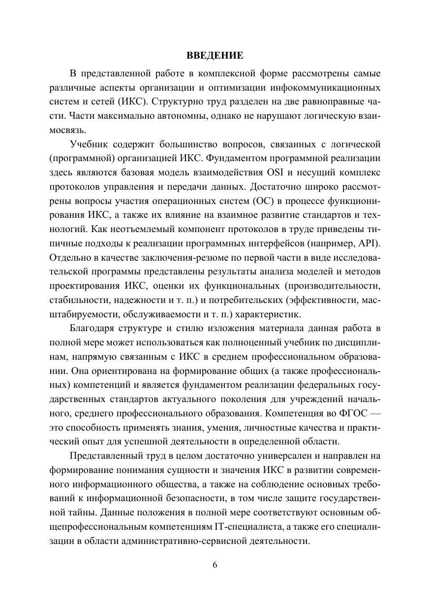В учебнике подробно рассмотрены вопросы, связанные с актуальным программным обеспечением, обеспечивающим функционирование современных инфокоммуникационных систем и сетей, например операционные системы и среды, типичные протоколы и программные интерфейсы и т. п. Также уделено отдельное внимание технологиям и подходам в сфере виртуализации. Освещены основные особенности и нюансы проектирования современных высоконагруженных систем и сетей корпоративного уровня. Учебник рекомендуется учащимся всех форм обучения в соответствии с ФГОС 3++ профессионального учебного цикла по специальностям среднего профессионального образования «Прикладная математика и информатика», «Информационные системы» и «Организация и технология защиты информации», изучающих курсы, непосредственно связанные с сетевыми технологиями, такие как «Компьютерные сети», «Инфокоммуникационные системы и сети», «Корпоративные информационные системы» и т.п. в качестве основной литературы.