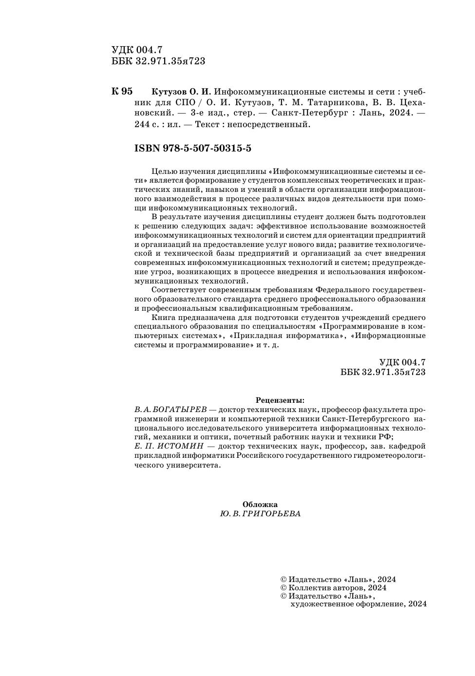 Целью изучения дисциплины «Инфокоммуникационные системы и сети» является формирование у студентов комплексных теоретических и практических знаний, навыков и умений в области организации информационного взаимодействия в процессе различных видов деятельности при помощи инфокоммуникационных технологий.В результате изучения дисциплины студент должен быть подготовлен к решению следующих задач: эффективное использование возможностей инфокоммуникационных технологий и систем для ориентации предприятий и организаций на предоставление услуг нового вида, развитие технологической и технической базы предприятий и организаций за счет внедрения современных инфокоммуникационных технологий и систем, предупреждение угроз, возникающих в процессе внедрения и использования инфокоммуникационных технологий. Книга предназначена для подготовки студентов учреждений среднего специального образования по специальностям «Программирование в компьютерных системах», «Прикладная информатика», «Информационные системы и программирование» и т. д. Соответствует современным требованиям Федерального государственного образовательного стандарта среднего профессионального образования и профессиональным квалификационным требованиям.