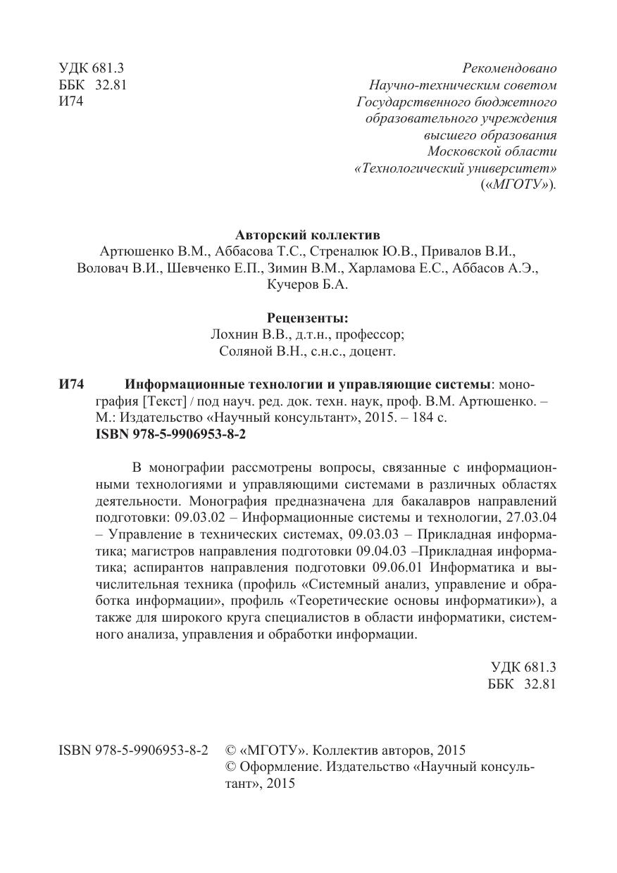 В монографии рассмотрены вопросы, связанные с информационными технологиями и управляющими системами в различных областях деятельности. Монография предназначена для бакалавров направлений подготовки: 09.03.02 - Информационные системы и технологии, 27.03.04 - Управление в технических системах, 09.03.03 - Прикладная информатика; магистров направления подготовки 09.04.03 -Прикладная информатика; аспирантов направления подготовки 09.06.01 Информатика и вычислительная техника (профиль «Системный анализ, управление и обработка информации», профиль «Теоретические основы информатики»), а также для широкого круга специалистов в области информатики, системного анализа, управления и обработки информации.