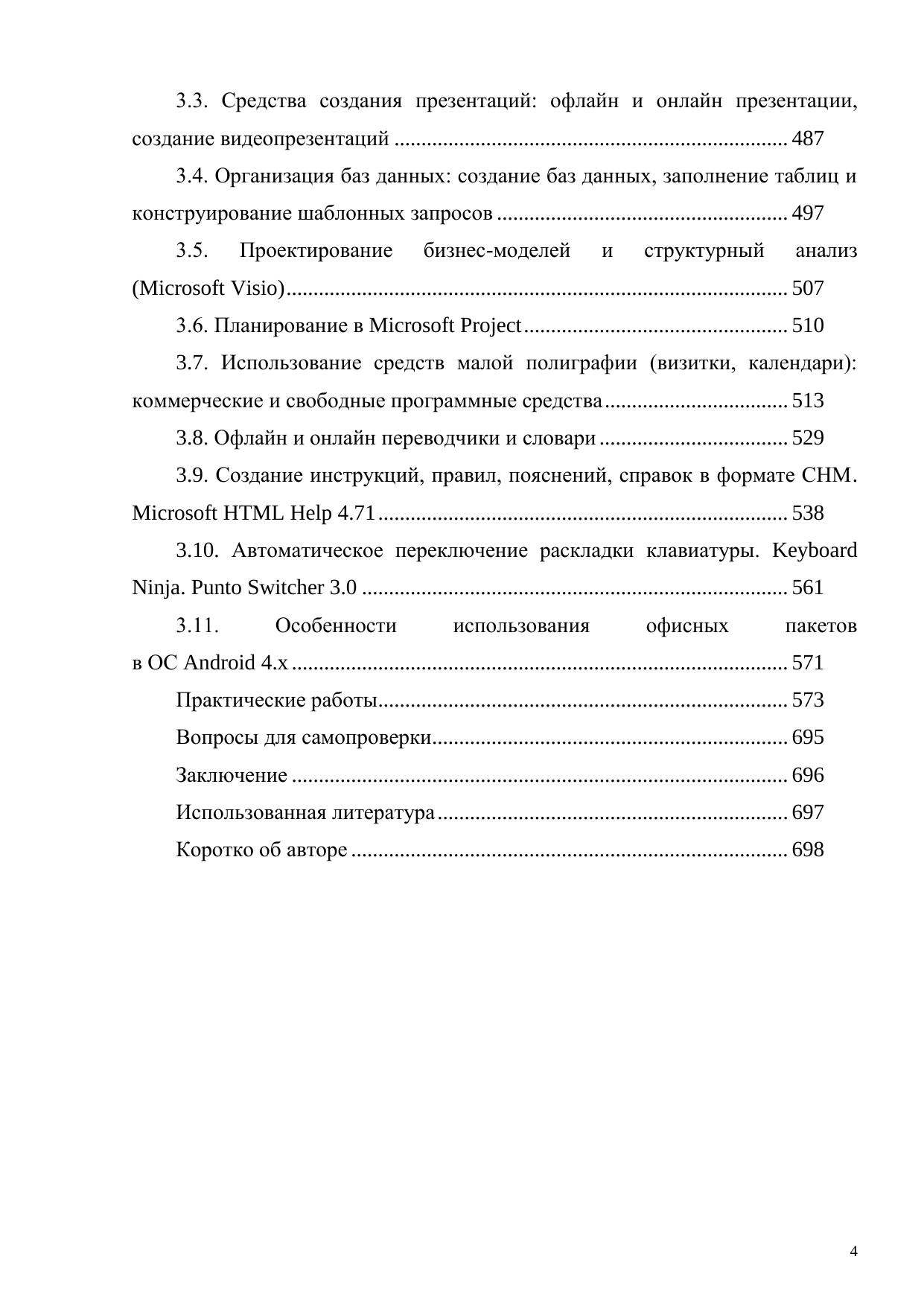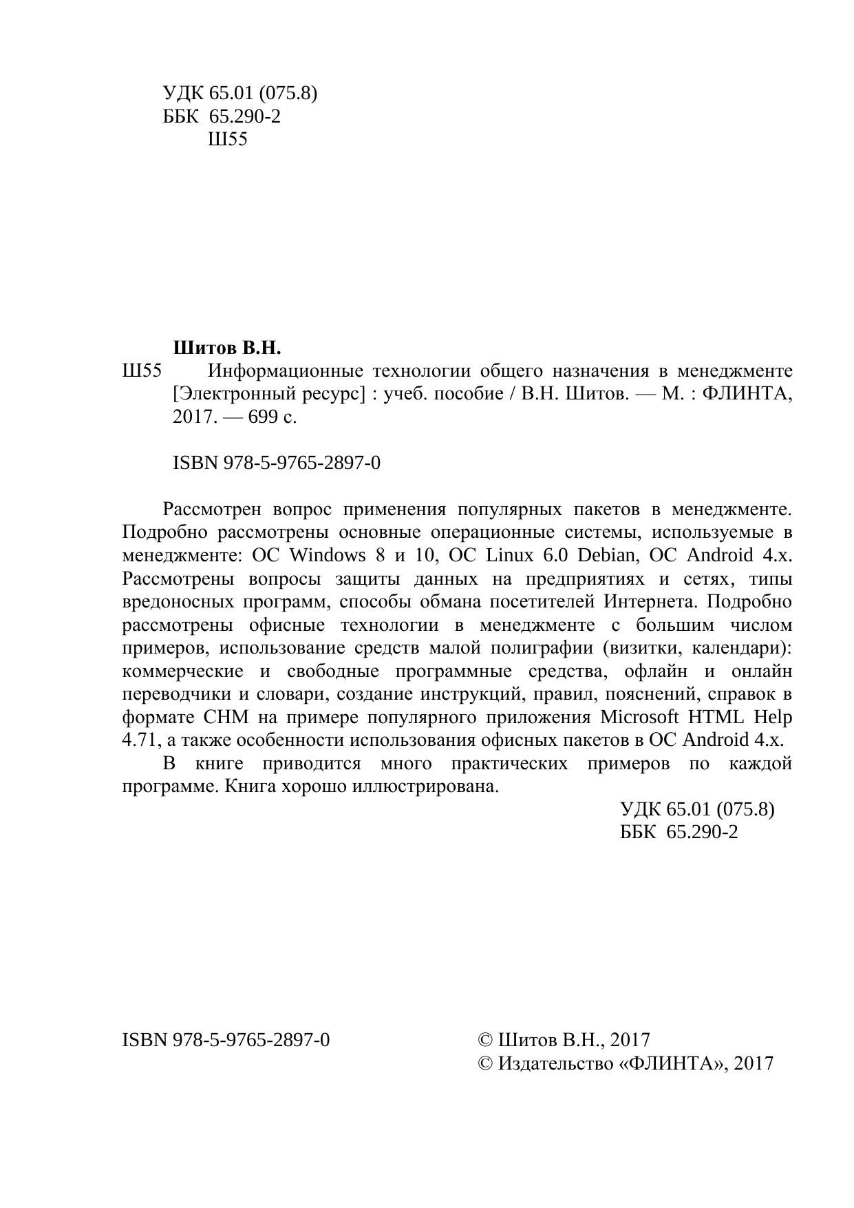 Рассмотрен вопрос применения популярных пакетов в менеджменте. Подробно рассмотрены основные операционные системы, используемые в менеджменте: ОС Windows 8 и 10, ОС Linux 6.0 Debian, ОС Android 4.x. Рассмотрены вопросы защиты данных на предприятиях и сетях, типы вредоносных программ, способы обмана посетителей Интернета. Подробно рассмотрены офисные технологии в менеджменте с большим числом примеров, использование средств малой полиграфии (визитки, календари): коммерческие и свободные программные средства, офлайн и онлайн переводчики и словари, создание инструкций, правил, пояснений, справок в формате CHM на примере популярного приложения Microsoft HTML Help 4.71, а также особенности использования офисных пакетов в ОС Android 4.x. В книге приводится много практических примеров по каждой программе. Книга хорошо иллюстрирована.