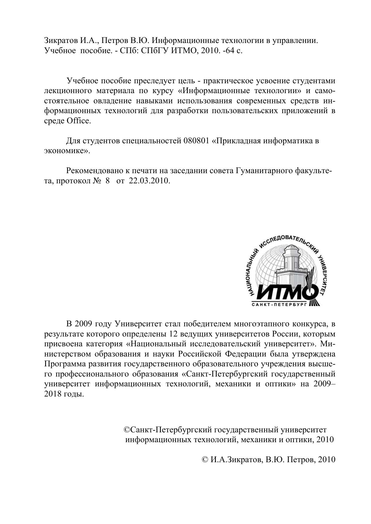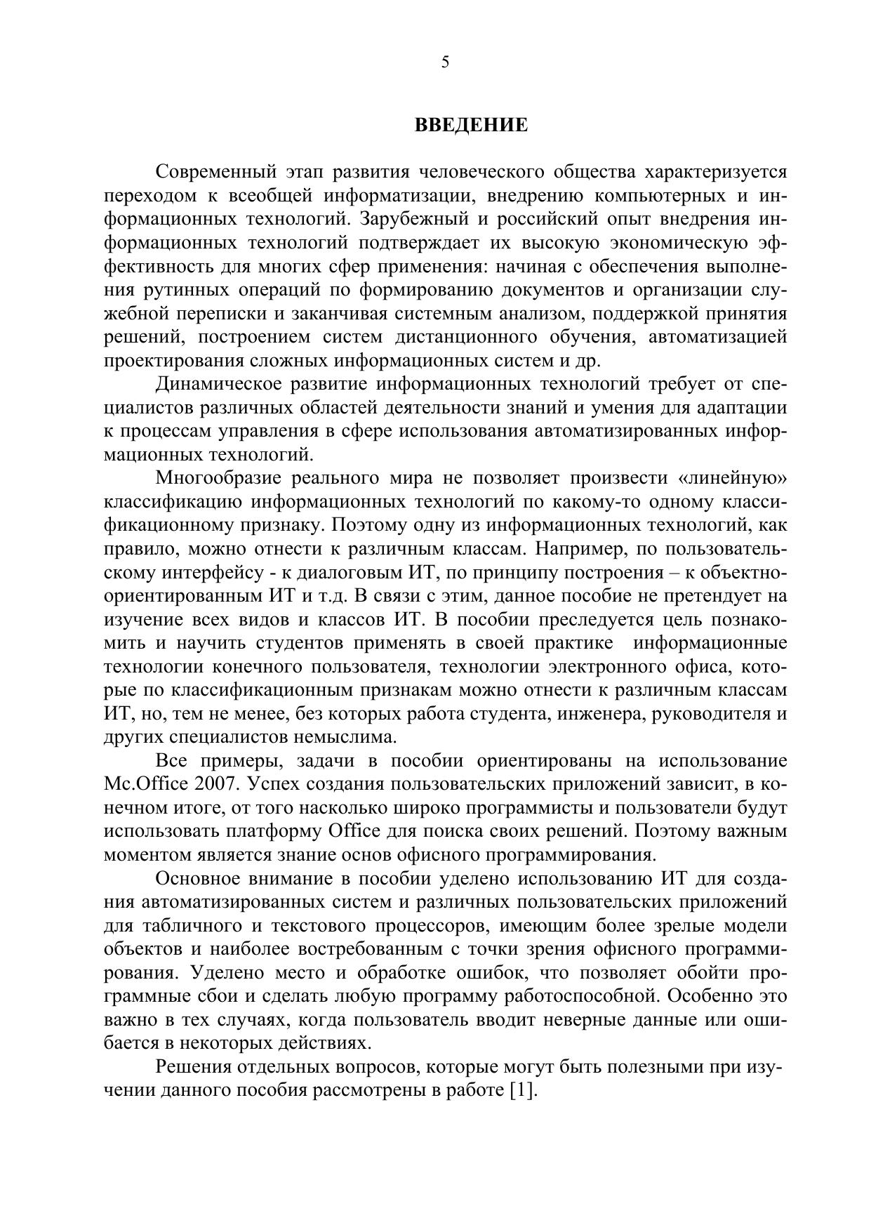 Учебное пособие преследует цель - практическое усвоение студентами лекционного материала по курсу «Информационные технологии» и самостоятельное овладение навыками использования современных средств информационных технологий для разработки пользовательских приложений в среде Office. Для студентов специальностей 080801 «Прикладная информатика в экономике».