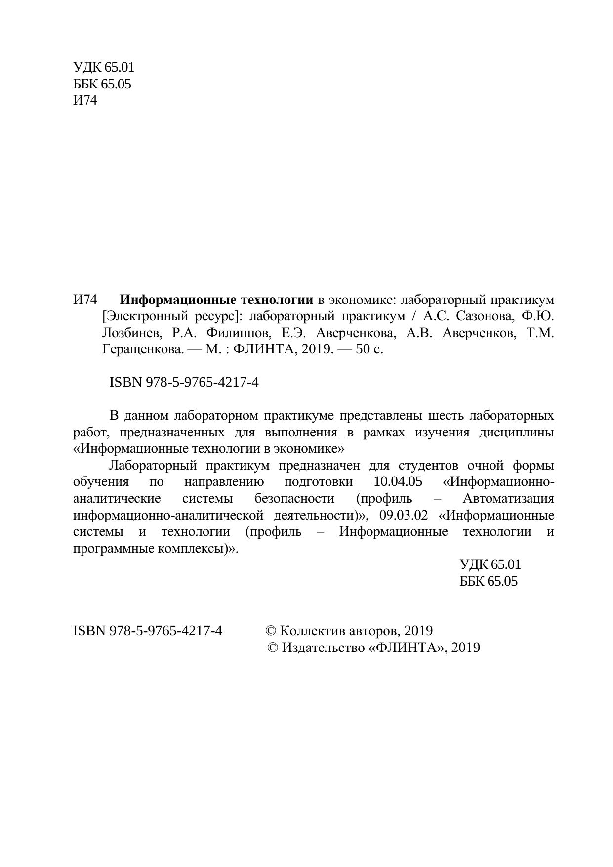 В данном лабораторном практикуме представлены шесть лабораторных работ, предназначенных для выполнения в рамках изучения дисциплины «Информационные технологии в экономике» Лабораторный практикум предназначен для студентов очной формы обучения по направлению подготовки 10.04.05 «Информационно-аналитические системы безопасности (профиль – Автоматизацияинформационно-аналитической деятельности)», 09.03.02 «Информационные системы и технологии