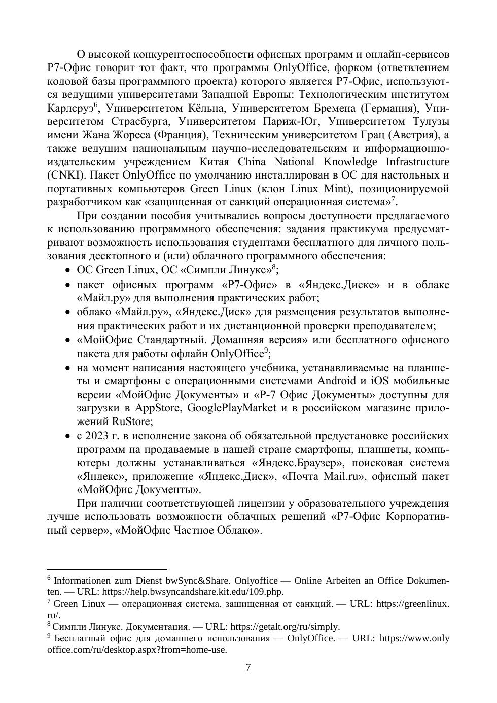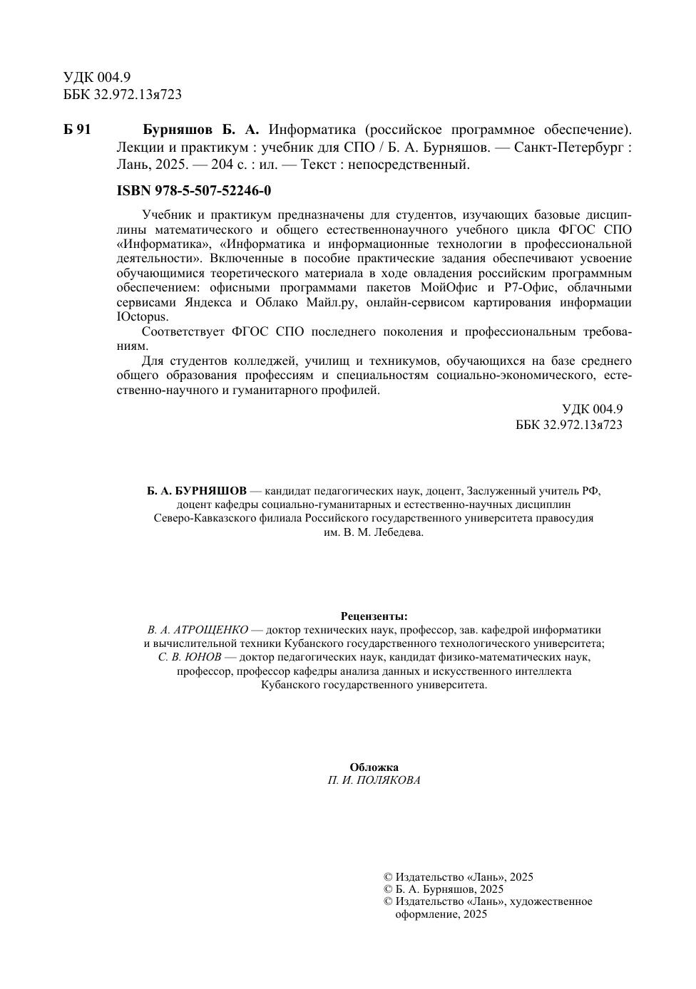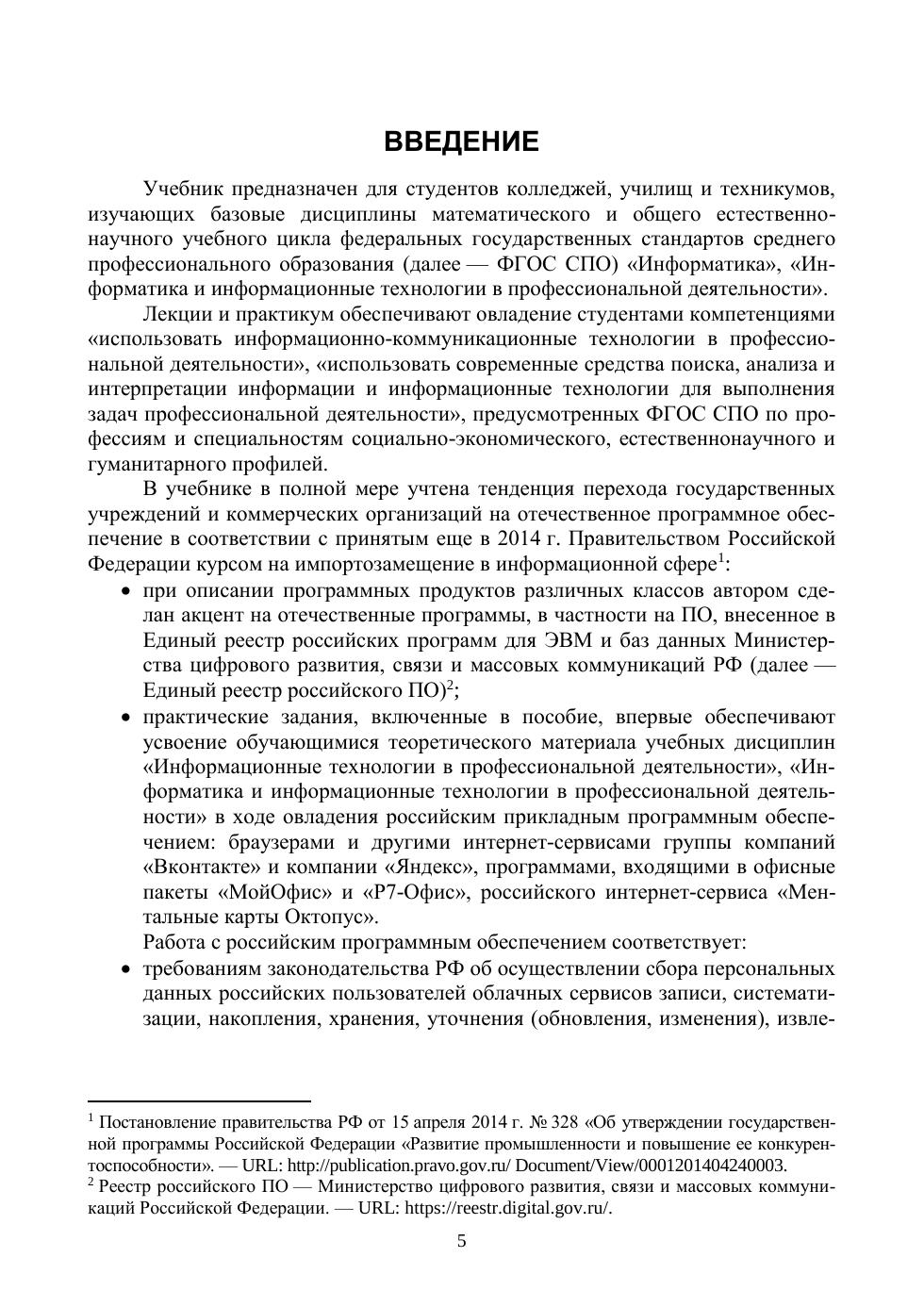 Учебник и практикум предназначены для студентов, изучающих базовые дисциплины математического и общего естественнонаучного учебного цикла ФГОС СПО «Информатика», «Информатика и информационные технологии в профессиональной деятельности». Включенные в пособие практические задания обеспечивают усвоение обучающимися теоретического материала в ходе овладения российским программным обеспечением: офисными программами пакетов МойОфис и Р7-Офис, облачными сервисами Яндекса и Облако Майл.ру, онлайн-сервисом картирования информации IOctopus. Соответствует ФГОС СПО последнего поколения и профессиональным требованиям. Для студентов колледжей, училищ и техникумов, обучающихся на базе среднего общего образования профессиям и специальностям социально-экономического, естественно-научного и гуманитарного профилей.