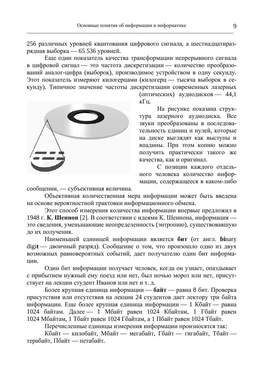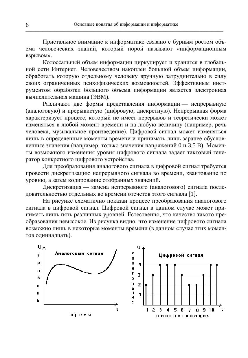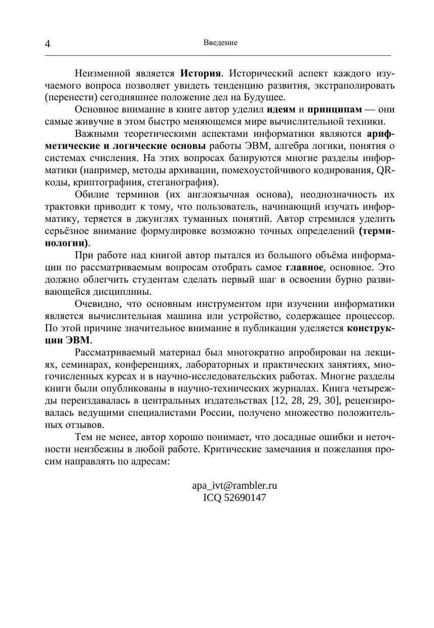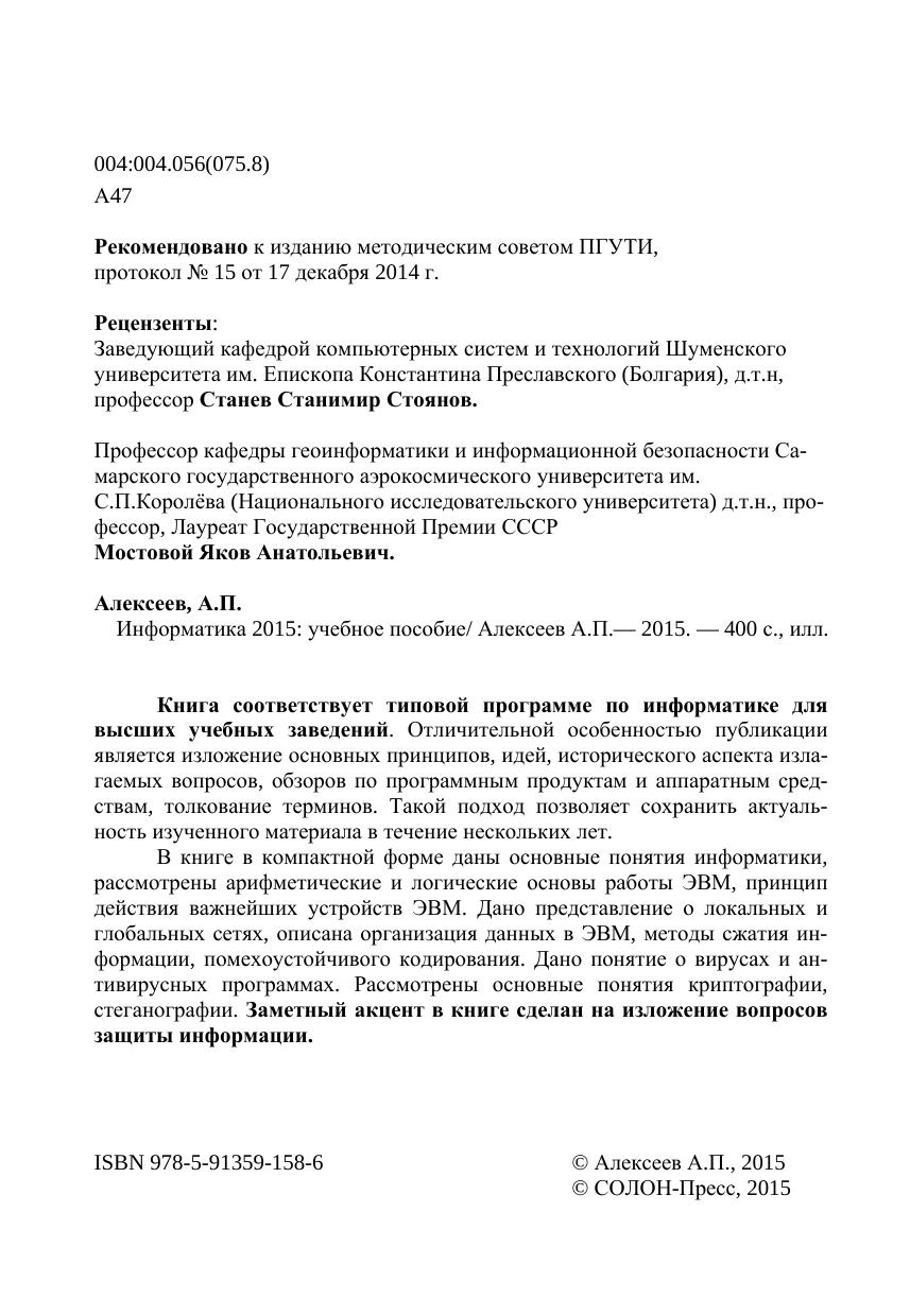 Книга соответствует типовой программе по информатике для высших учебных заведений. Отличительной особенностью публикации является изложение основных принципов, идей, исторического аспекта излагаемых вопросов, обзоров по программным продуктам и аппаратным средствам, толкование терминов. Такой подход позволяет сохранить актуальность изученного материала в течение нескольких лет. В книге в компактной форме даны основные понятия информатики, рассмотрены арифметические и логические основы работы ЭВМ, принцип действия важнейших устройств ЭВМ. Дано представление о локальных и глобальных сетях, описана организация данных в ЭВМ, методы сжатия информации, помехоустойчивого кодирования. Дано понятие о вирусах и антивирусных программах. Рассмотрены основные понятия криптографии, стеганографии. Заметный акцент в книге сделан на изложение вопросов защиты информации.