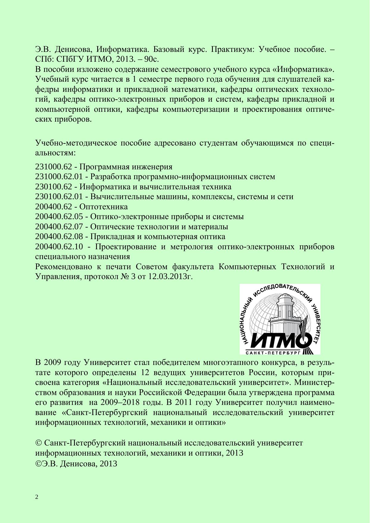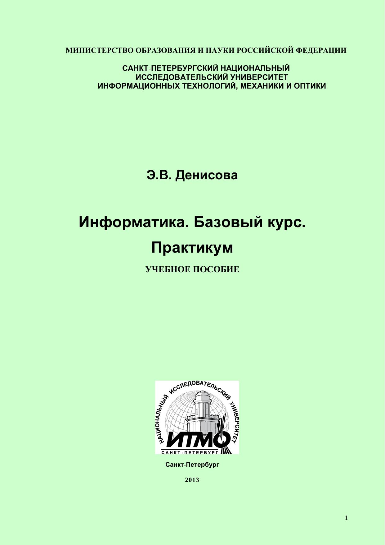 В пособии изложено содержание семестрового учебного курса «Информатика». Учебный курс читается в 1 семестре первого года обучения для слушателей кафедры информатики и прикладной математики, кафедры оптических технологий, кафедры оптико-электронных приборов и систем, кафедры прикладной и компьютерной оптики, кафедры компьютеризации и проектирования оптических приборов.