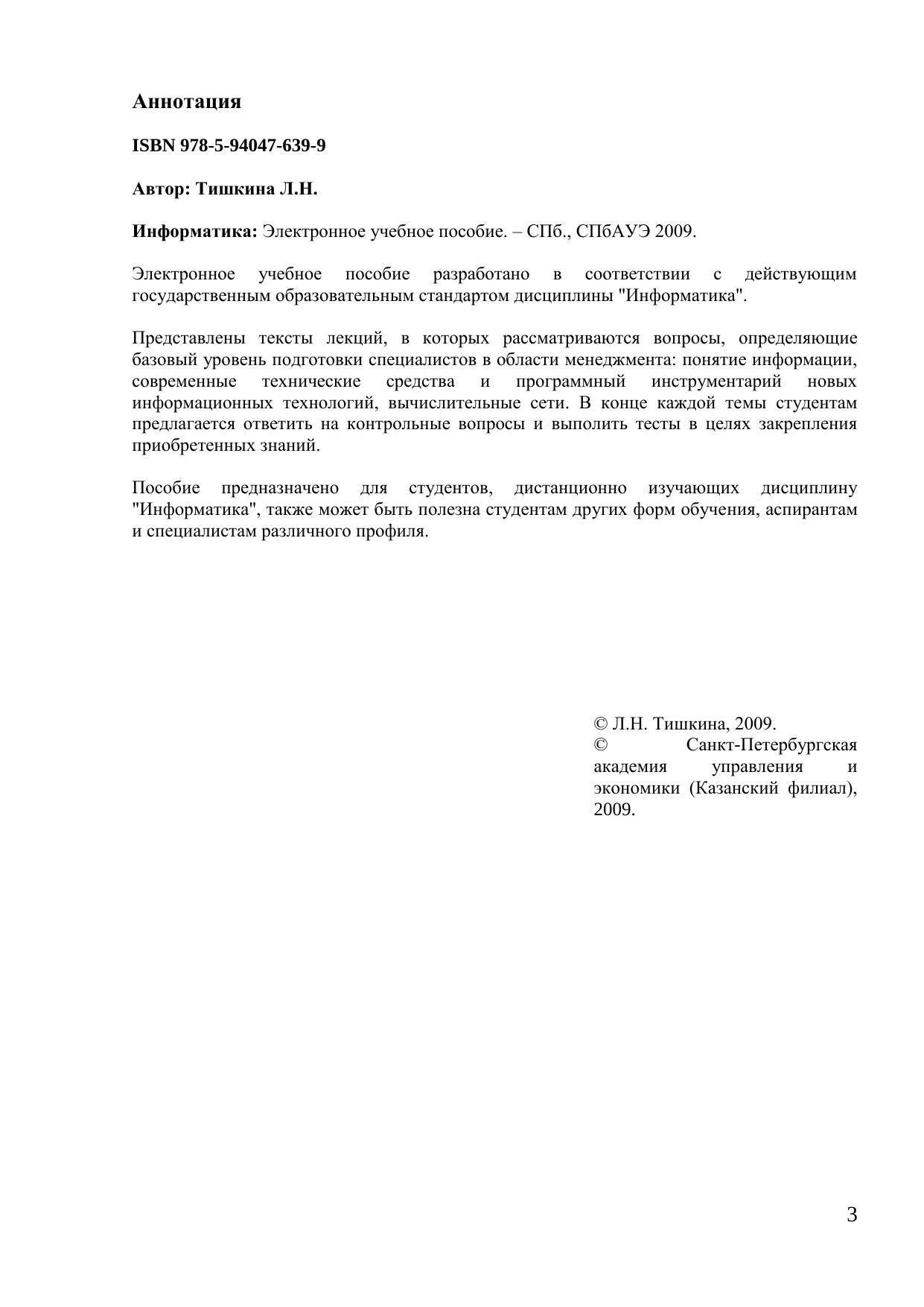 Электронное учебное пособие разработано в соответствии с действующим государственным образовательным стандартом дисциплины "Информатика". Представлены тексты лекций, в которых рассматриваются вопросы, определяющие базовый уровень подготовки специалистов в области менеджмента: понятие информации, современные технические средства и программный инструментарий новых информационных технологий, вычислительные сети. В конце каждой темы студентам предлагается ответить на контрольные вопросы и выполнить тесты в целях закрепления приобретенных знаний. Пособие предназначено для студентов, дистанционно изучающих дисциплину "Информатика", также может быть полезна студентам других форм обучения, аспирантам и специалистам различного профиля. Электронное учебное пособие для дистанционного обучения