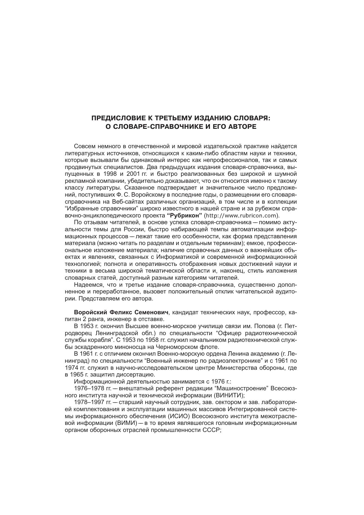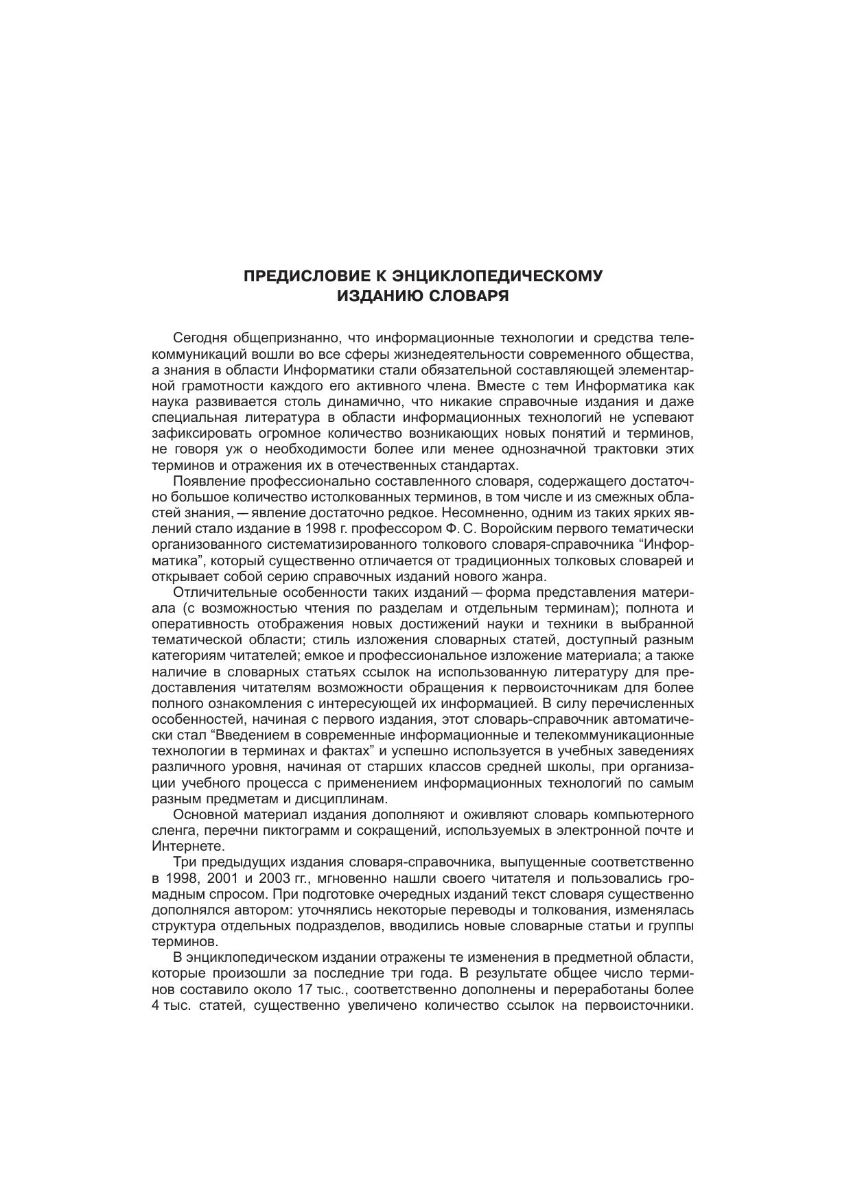 Энциклопедический словарь-справочник содержит более 18 тыс. русско- и англоязычных терминов, тематически систематизированных по следующим крупным разделам: I. Основы информационной технологии II. Автоматизация информационных процессов и автоматизированные системы (АС) III. Техническое обеспечение АС IV. Программное обеспечение АС V. Мультимедиа, гипермедиа, виртуальная реальность, машинное зрение VI. Сетевые технологии обработки и передачи данных VII. Компьютерный и сетевой сленг VIII. Пиктограммы, использующиеся в электронной почте IX. Сокращения слов и выражений, использующиеся винтернете. Словарные статьи носят расширенный характер и включают в себя справочные данные об объектах описания, а также ссылки на первичные документальные источники для более полного ознакомления с ними заинтересованных в этом пользователей. Структура и содержание словаря позволяют использовать его для систематизированного изучения материалов по интересующим читателя тематическим разделам и подразделам, производитьп редварительную проработку решений, связанных с проектированием разнородных автоматизированных информационных и телекоммуникационных систем, а также готовитьн аего основе учебно-методические, обзорные, справочные и др. документы. Словарь ориентирован на широкий круг пользователей, профессиональная деятельностьили интересы которых связаны с современными информационными технологиями.