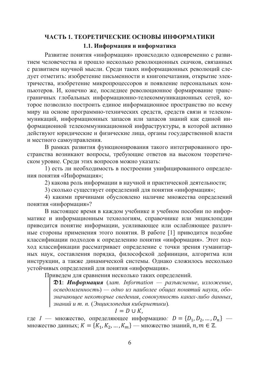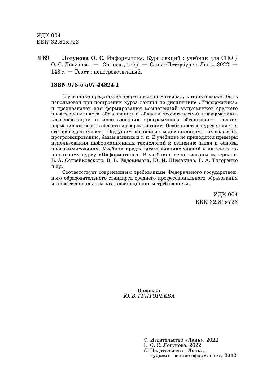 В учебнике представлен теоретический материал, который может быть использован при построении курса лекций по дисциплине «Информатика» и предназначен на формирование компетенций выпускников среднего профессионального образования в области теоретической информатики, классификации и использования программного обеспечения, знания нормативной базы в области информатизации. Особенностью курса является его пропедевтичность к будущим специальным дисциплинам этих областей: программирование, базы данных ит.п. В учебнике не приводятся примеры использования информационных технологий к решению задач и основы программирования. Учебник предполагает наличие знаний у читателя по школьному курсу «Информатика». В учебнике использованы материалы В. А. Острейковского, В. В. Евдокимова, Ю. И. Шемакина, Г. А. Титоренко и др.