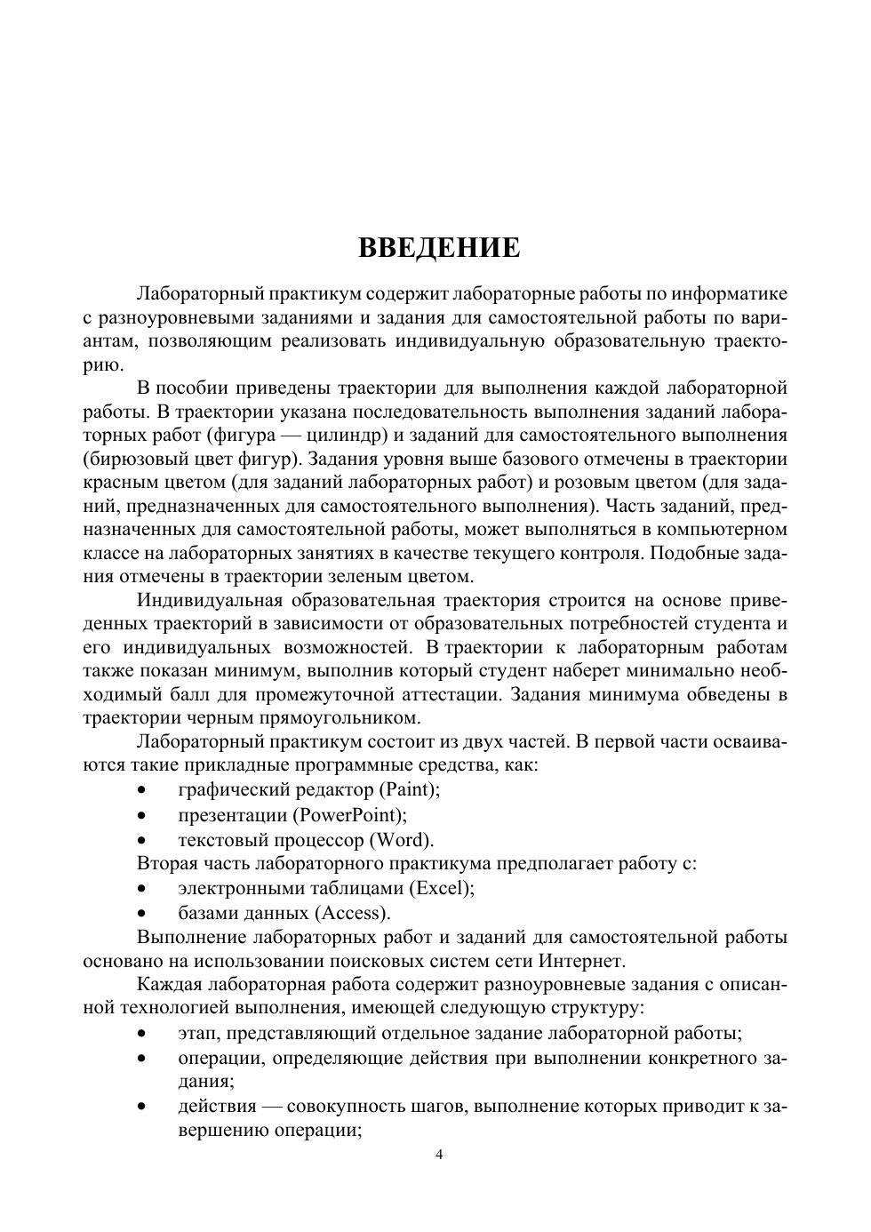 Практикум содержит лабораторные работы по информатике с разноуровневыми заданиями и задания для самостоятельной работы по вариантам, позволяющим реализовать индивидуальную образовательную траекторию. Лабораторный практикум предназначен для освоения таких прикладных программных средств как графический редактор (Paint), презентации (Power Point) и текстовый процессор (Word). Выполнение лабораторных работ и заданий для самостоятельной работы также предполагает использование поисковых систем сети Internet.