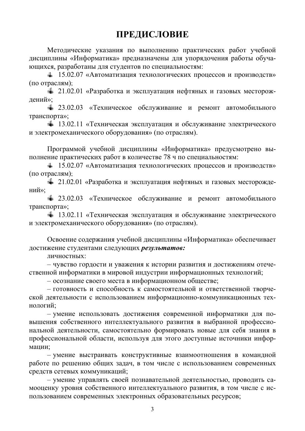 Методические указания по выполнению практических работ учебной дисциплины «Информатика» разработаны в соответствии с «Рекомендациями по организации получения среднего общего образования в пределах освоения образовательных программ среднего профессионального образования на базе основного общего образования с учетом требований федеральных государственных образовательных стандартов и получаемой профессии или специальности среднего профессионального образования».