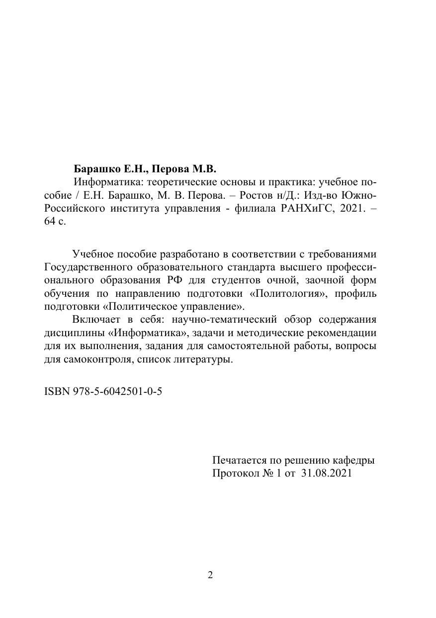 Учебное пособие разработано в соответствии с требованиями Государственного образовательного стандарта высшего профессионального образования РФ для студентов очной, заочной форм обучения по направлению подготовки «Политология», профиль подготовки «Политическое управление». Включает в себя: научно-тематический обзор содержания дисциплины «Информатика», задачи и методические рекомендации для их выполнения, задания для самостоятельной работы, вопросы для самоконтроля, список литературы.