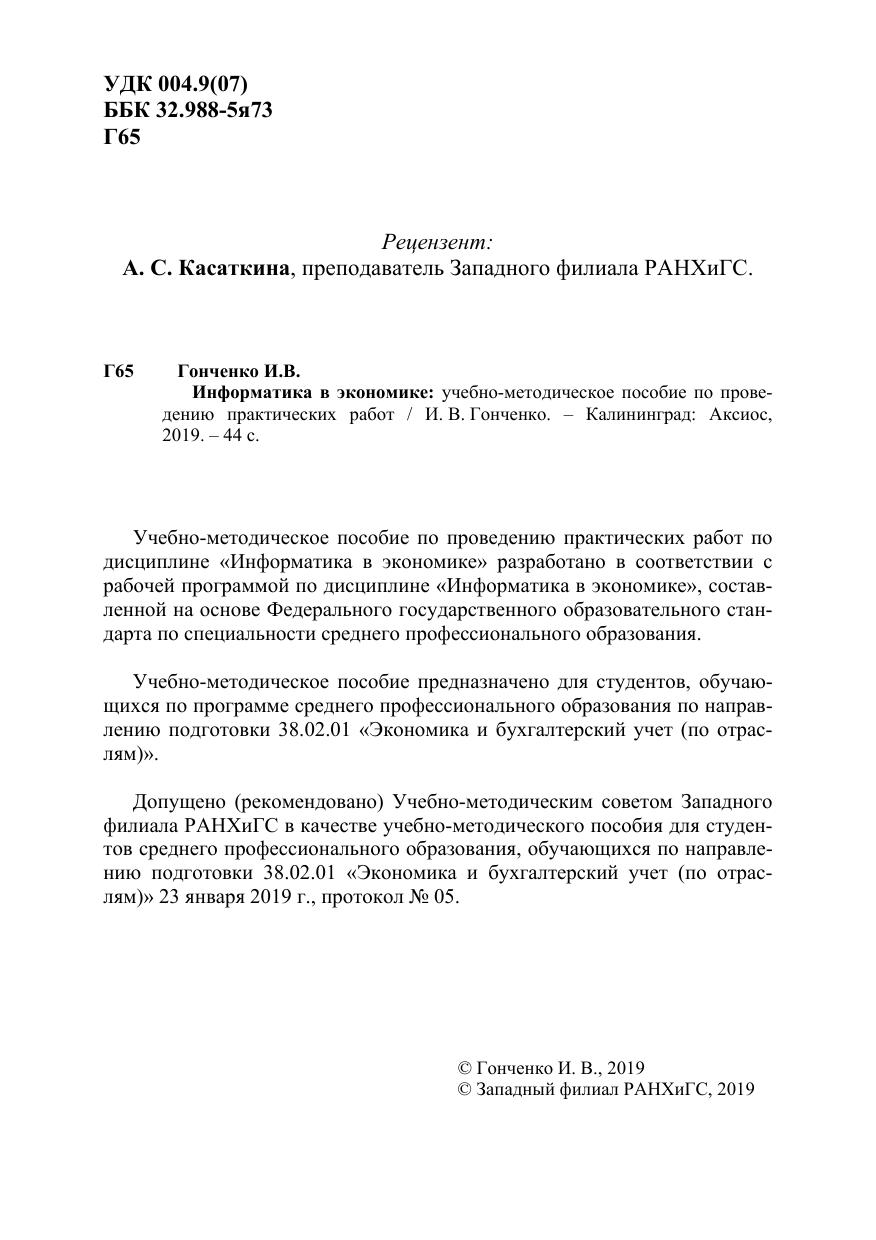 Учебно-методическое пособие по проведению практических работ по дисциплине «Информатика в экономике» разработано в соответствии с рабочей программой по дисциплине «Информатика в экономике», составленной на основе Федерального государственного образовательного стандарта по специальности среднего профессионального образования.