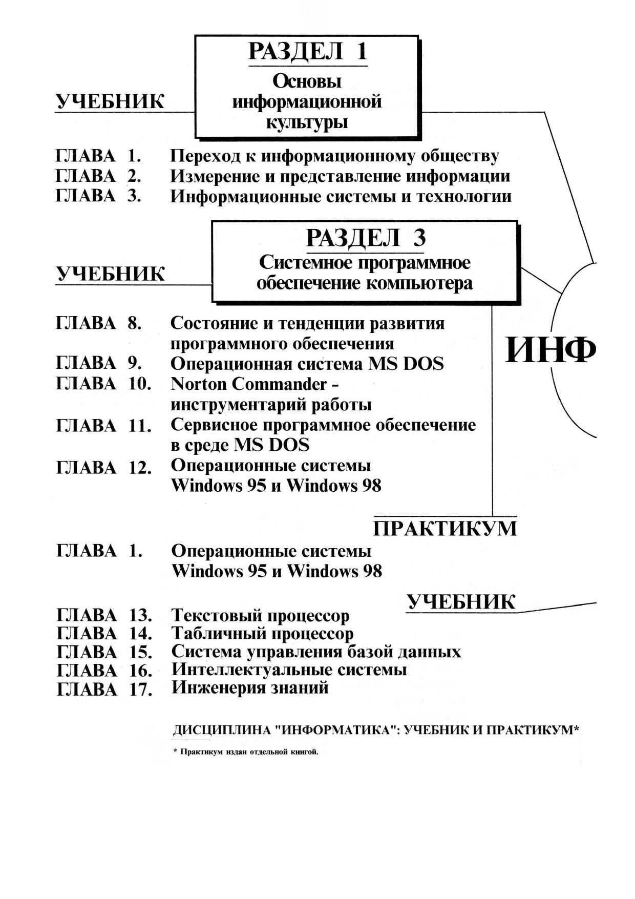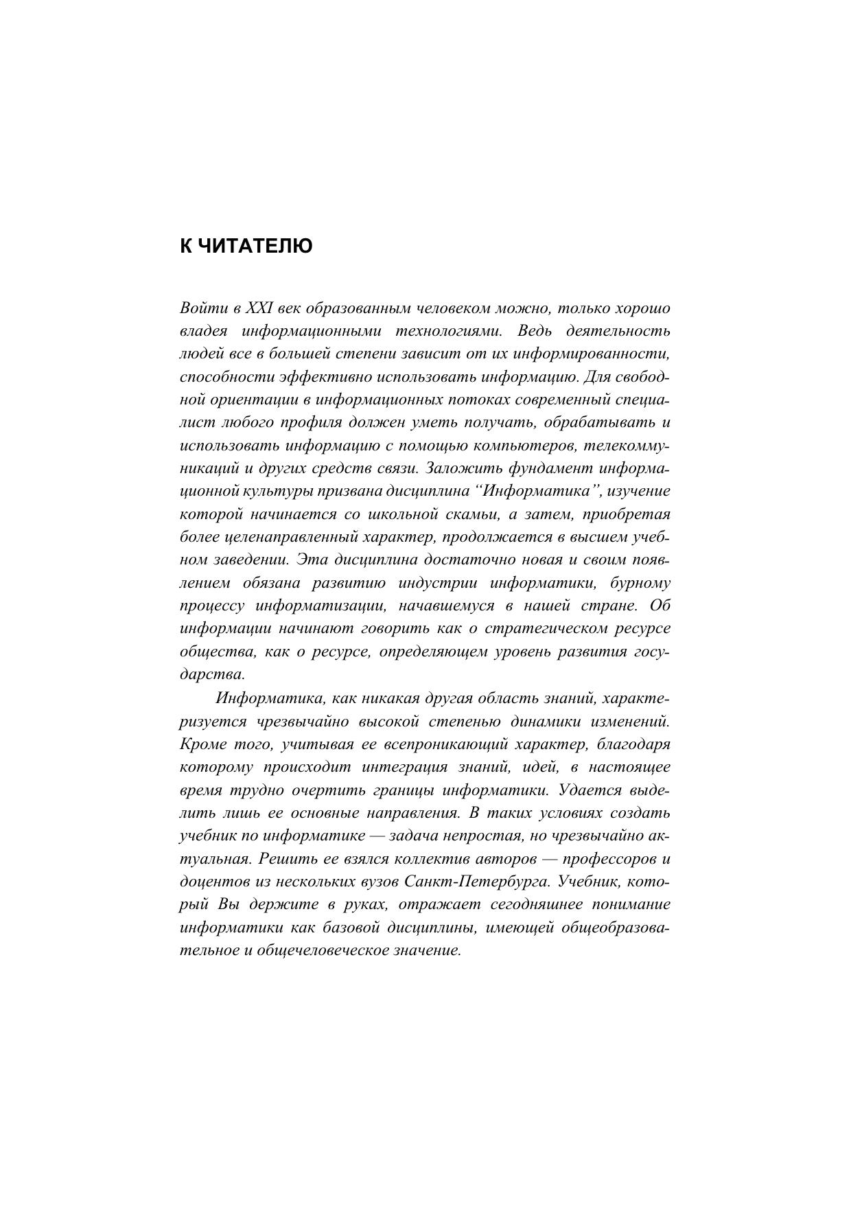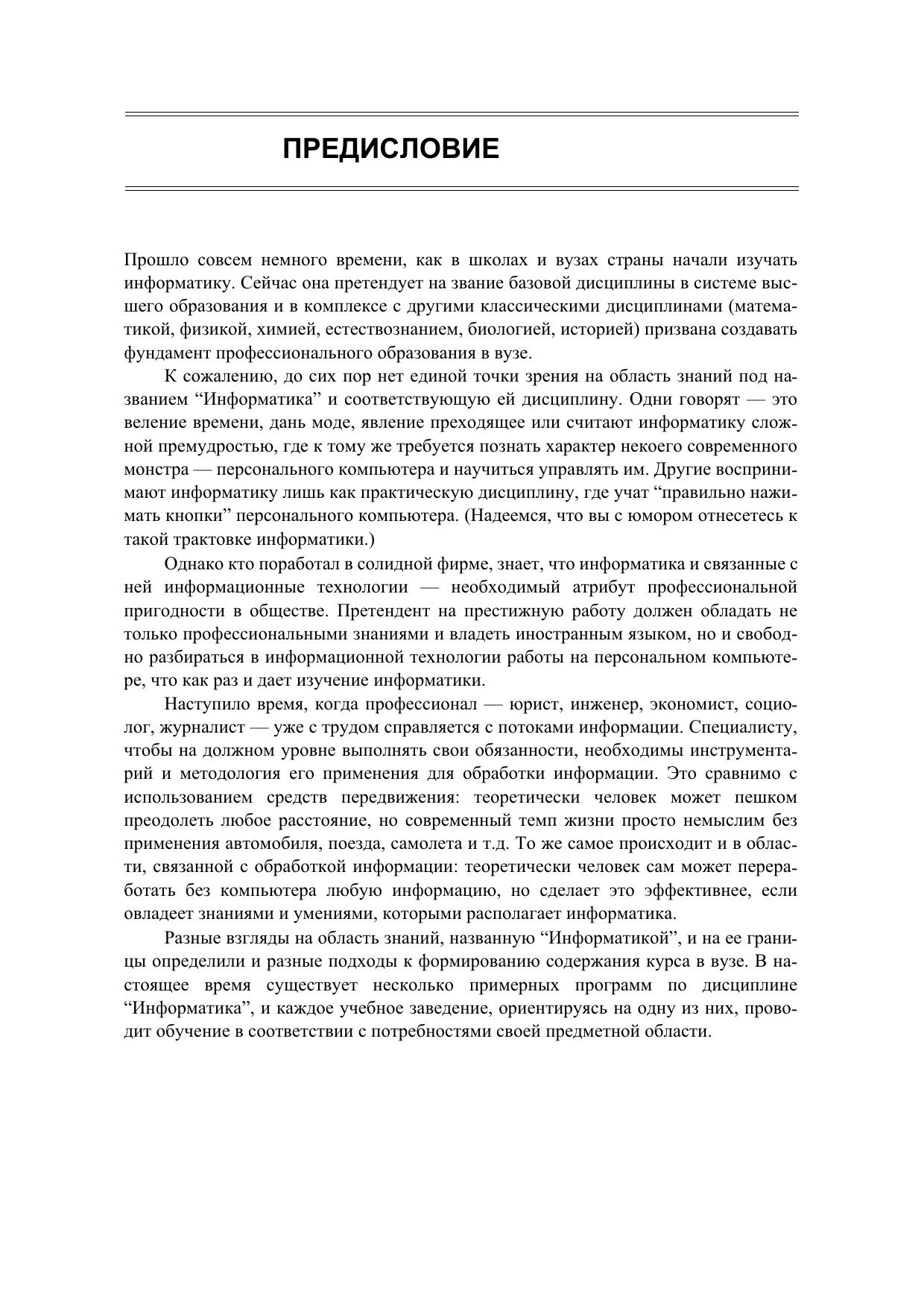 Рассмотрены разделы информатики, определяющие базовый уровень подготовки специалистов: основы информационной культуры, современные технические средства и программный инструментарий новых информационных технологий (системное и прикладное программное обеспечение, инструментарий создания программных продуктов). Для студентов, изучающих дисциплину «Информатика», преподавателей, слушателей институтов повышения квалификации; может быть использован широким кругом пользователей персонального компьютера.